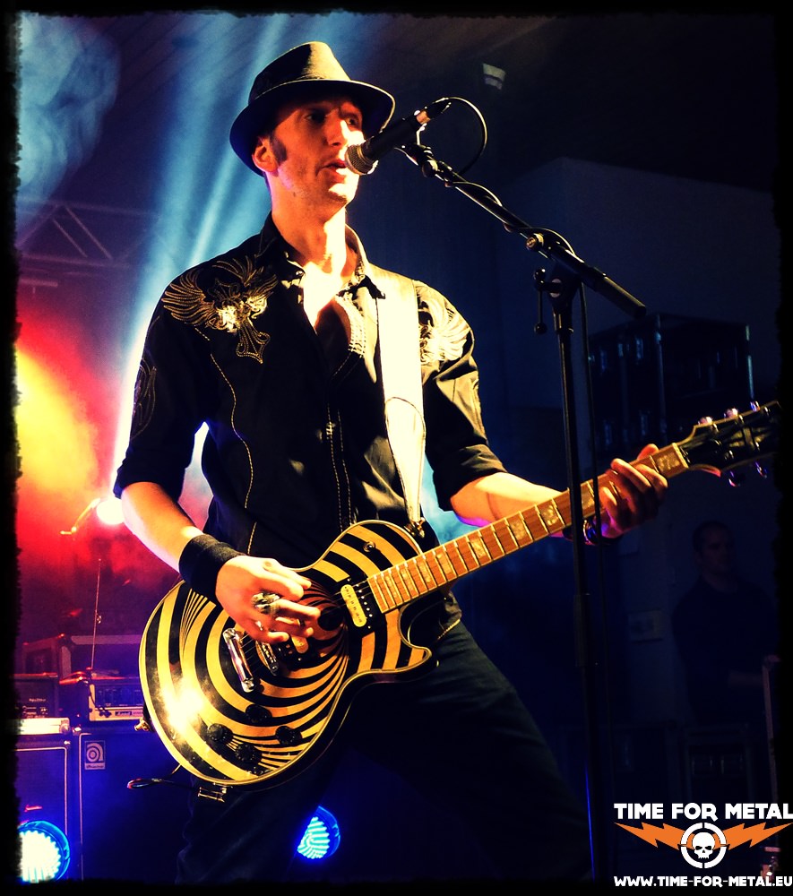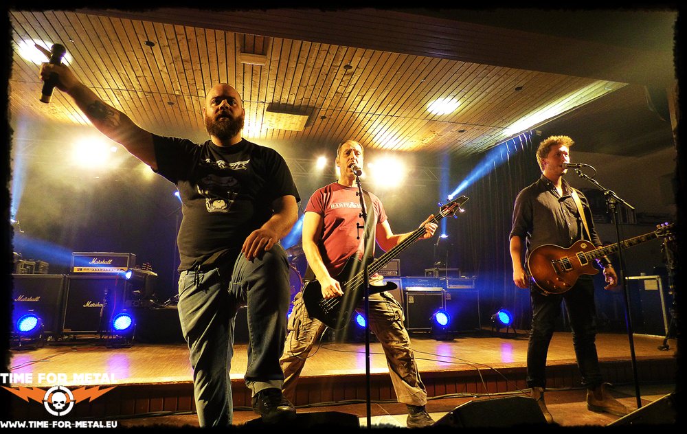 Als erste Band des Abends entern King Savage aus Karlsruhe mit leichter Verspätung die Bühne, welche englischsprachige Songs aus eigener Feder bieten. Mhm, das sind aber irgendwie nicht die Onkelz. Nein, natürlich nicht, denn schon fast traditionell eröffnet hier immer eine Band aus der Region, die dem Publikum zum Aufwärmen eigene Songs um die Ohren haut. Die Band besteht in dieser Zusammensetzung erst seit 2015, ging jedoch aus der Formation Lucky Twist hervor. Erfahrene Vollblutmusiker, die erst kürzlich als offizieller Tour Support der Südstaaten Rocker Molly Hatchet durch Europa zogen. Frontmann und Sänger Arthur King gibt von Beginn an Vollgas, obwohl die Onkelz Fans sich noch recht zurückhaltend geben. Das Gros der Besucher hält sich noch im hinteren Teil der Halle auf, versorgt sich mit Getränken und begutachtet das Merchandise. Aber gleich der zweite Song, das selbst betitelte King Savage, geht zumindest mir gut ins Ohr. Der rotzige Rock der Karlsruher, ein Mix aus Blues und Sleaze / Glam Rock mit einer leichten Countryprise, ist durchaus in den 80ern angesiedelt und lädt ein zum Partymachen. So dauert es auch nicht lange, bis einige Besucher ein paar Meter näher an die Bühne herantreten, wenn auch erst nach mehrmaliger Aufforderung des Frontmannes. Mit den nächsten Songs wird dann auch klar, warum Sänger King seine Mähne mit einem schwarzen Stirnband bändigen muss, denn der Mann legt ein ordentliches Laufpensum an den Tag und ist ständig aktiv. Auch die Saitenfraktion mischt ordentlich mit, post am Bühnenrand und besticht durch häufigen Seitenwechsel. Das System, klischeehafte Texte treffen auf klassische Rockriffs, funktioniert fast immer und so versammeln sich immer mehr Besucher in Bühnennähe, auch wenn die erste Reihe partout gemieden wird. Am besten gefällt mir jedoch die whiskeytriefende Stimme, die ein wenig an den verstorbenen Lemmy Kilmister erinnert. Wenn die Jungs noch etwas am Wiedererkennungswert ihrer zukünftigen Songs arbeiten, ist der Southern Rock vielleicht doch noch nicht verloren. Alles in allem aber ein sehenswürdiger Opener, der mit viel Engagement zur Sache geht. Warum allerdings die letzten drei Songs von der Setlist gestrichen werden, wird wohl auf ewig ein Geheimnis bleiben. Vielleicht reichte letztendlich die Zeit nicht, oder vor der Bühne war zu wenig los …, I don`t know. Eins noch, in Zukunft sollte man aber bei der Abstimmung des Bühnenoutfits etwas besser hinschauen, aber das ist jetzt schon wieder meckern auf hohem Niveau.