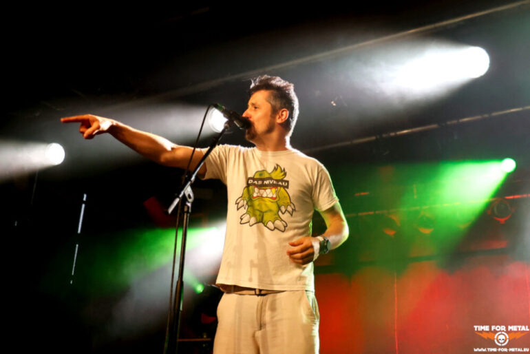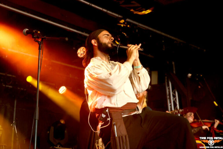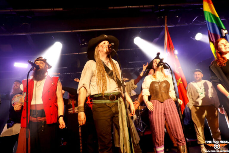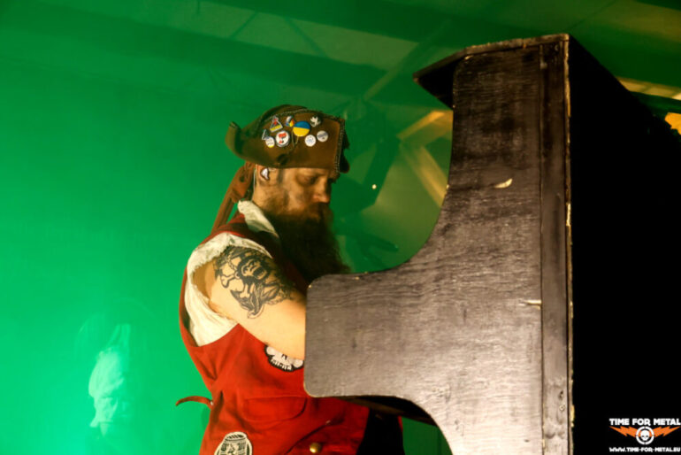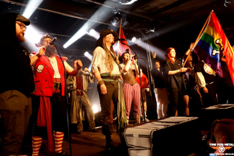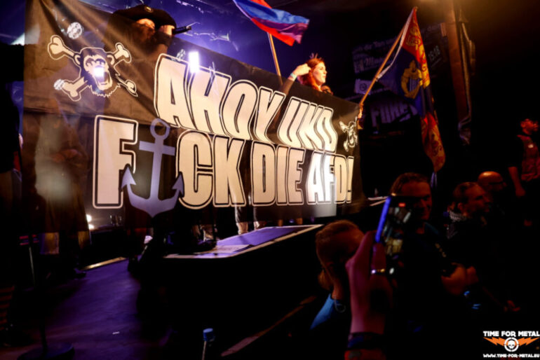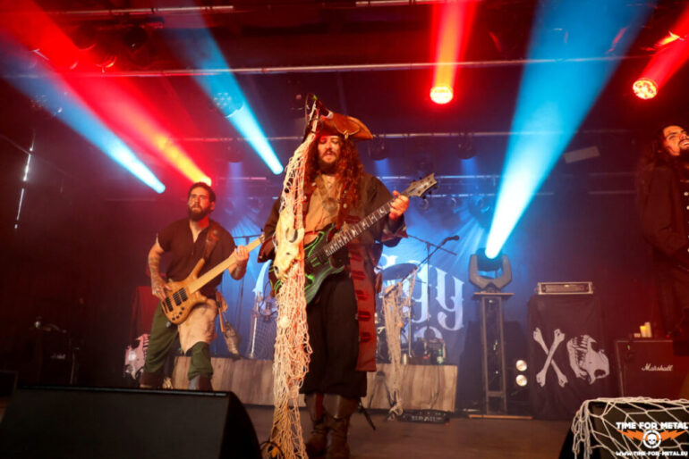 Der Stilbruch kommt von den Faröer Inseln. Hamradun um den ehemaligen Týr-Sänger Pól Arni Holm haben mit Hetjuslóð 2024 eine neue LP veröffentlicht. Musikalisch gibt es Folk Metal, aber auch harsche Vocals in Richtung Viking- oder Pagan Metal. Die Lyrics sind in lokaler Sprache, sodass die Songs sich Jallgríms Kvæði oder Grimmer Går På Gulvet nennen. Insgesamt circa 50 Minuten metallische Kost mit anständiger Saitenarbeit, die die Piraten vor der Bühne ordentlich durchschüttelt und die Menschen mit einer Vorliebe für metallische Klänge anlockt. Starker Gig, der vor allem durch die nordische Sprache einen sehr speziellen Touch liefert. Die LPs finden nach der Show reichlich Absatz und sind am Ende ausverkauft.