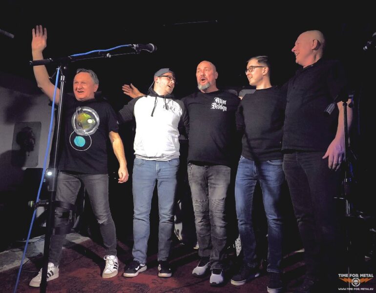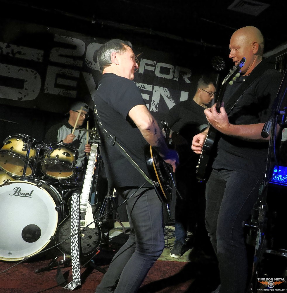 Nach den beiden Tygers Of Pan Tang-Songs, der Lita Ford-Ballade Just A Feeling inklusive Gitarreneinsatz von Marcel und dem eigenen ruhigeren Stück I Remember You geht es schneller weiter. Ghost von Skid Row, Alter Bridges Before Tomorrow Comes und Control von Puddle Of Mudd läuten das Ende ein. Noch ein eigenes Stück, und dann ist auch schon fast Schluss. Als Zugabe folgt der U2-Kracher Bullet The Blue Sky, und da der Text sehr lang ist, muss Marcel sich eine kleine Texthilfe holen. Sein Textprompter ist ein gut bestückter Ordner, in dem sich die Worte, die sonst Bono singt, abgeheftet finden. Das Stück lebt aber eigentlich von der Instrumentalfraktion, die sich hier richtig austoben darf. Lange Improvisationen und Klanggewitter lassen den Song leben. So ufert es aus, und gefühlte zwanzig Minuten später endet das gitarrenlastige Stück und hinterlässt Begeisterung. Es zeigt sich, dass Jörg und Wolle gut zusammen agieren, was sie allerdings auch vorher schon bewiesen haben. Aber auch Marcel hat nichts verlernt und führt sicher und gewohnt amüsant durch das Programm. Auch die gesangliche Leistung überzeugt, obwohl seine Stimme ab und an von den Gitarren fast übertönt wird. Insgesamt ist der Sound gut, und auch lichttechnisch ist nichts auszusetzen, obwohl es mir als Fotograf eigentlich immer zu dunkel ist. Viertel nach elf ist das alles zu Ende, und sichtlich erleichtert ob des gelungenen Comebacks treffen wir die Jungs noch mal kurz, um positives Feedback dazulassen. Im Nachgang erfahre ich, dass sie im Anschluss noch ein paar Stücke gespielt haben. Da waren wir bereits auf dem Heimweg, aber wenn sich alle zusammenraufen, geht die Geschichte von 20 For Seven weiter.