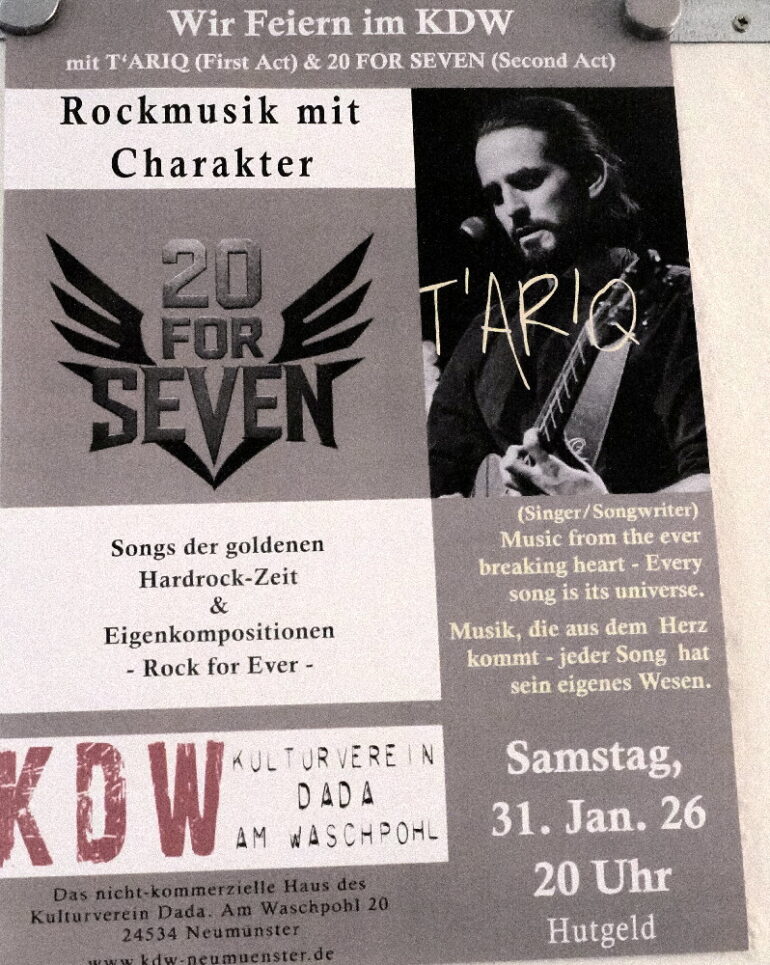 Heute lassen wir den Underground mal ran. Erst vor ein paar Tagen bekam ich eine Mitteilung von Marcel Jaeger, dass sich 20 For Seven, eine Hardrockband aus Rendsburg, entschlossen haben, ihre dreijährige Pause zu beenden und fortan wieder zusammenzuarbeiten. So soll diesen Samstag, also heute, im Neumünsteraner KDW, einem gemeinnützigen Kulturverein, ein erster Auftritt stattfinden. Kurz überlegt und dann entschlossen, da mal hinzufahren. Der Beginn ist mit 20:00 Uhr angegeben, aber durch die verspätete Essensaufnahme und auch noch den Fußweg, da das Auto viel zu weit weg geparkt ist, kommen wir erst kurz nach acht an. Das macht aber nichts, denn losgehen soll das erst gegen halb neun. Der Verein ist uns gänzlich unbekannt, scheint aber ein Treffpunkt zu sein, der sich selbst finanziert und durch Kino, Vorlesungen, Ausstellungen sowie Konzerte ein kulturelles Angebot bereithält. Dazu kommen günstige Preise und eine freundliche Atmosphäre, und somit freuen wir uns. Vor der Tür treffen wir noch Gabi, die Frau des Sängers Marcel, die uns freudig begrüßt. Wir gehen rein, denn es ist schon sehr frisch, und nachdem die beschlagene Brille wieder Durchsicht bietet, machen wir uns auf die Suche nach der Bühne. Da treffen wir auf Marcel und Jörg, die sich beide freuen, uns zu sehen, haben wir uns doch schon seit Jahren nicht mehr gesehen. Da gibt es natürlich einiges zu quatschen, und dabei erfahren wir, dass sich Marcel und Jörg Schlegel (Gitarrist von 20 For Seven) im letzten Jahr getroffen haben, um das Projekt wieder aufleben zu lassen. Es mussten allerdings neue Mitstreiter gefunden werden, da die übrigen Bandmitglieder nicht mehr zur Verfügung standen. Das gestaltete sich nicht ganz so schwierig, und mit dem zweiten Gitarristen Wolfgang „Wolle“ Machholz, dem Schlagzeuger Thomas Wuschel Schink und dem Bassisten Cedrik Röh ist die Combo komplett. Was sie draufhaben, hören wir später. Zunächst ist da noch T’Ariq, ein Singer-Songwriter, der hier gegen Viertel vor neun anfängt. Grund des Ganzen ist der 70. Geburtstag des Vereinsvorsitzenden, der dies heute sozusagen als Geburtstagsparty schmeißt. Somit kostet es keinen Eintritt, aber ein Hut geht rum, in dem die Gage für die beiden Acts gesammelt wird. Nach den ersten Songs zieht es uns aber in den Barbereich, denn mit dem, was dargeboten wird, können wir so gar nichts anfangen. Immerhin hat er viele Zuhörer, und die beklatschen seine Songs.