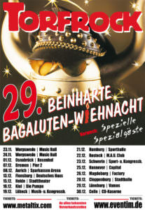 Im 41. Jahr Torfrock die 29. Bagaluten-Wiehnacht. Sicher, damals wurde die Bagaluten-Wiehnacht auch im Süden der Republik gefeiert. Dem Alter geschuldet bleiben die Torfis, wie sie liebevoll von ihren Fans genannt werden, im Norden. Halbzeit ist nun nach Worpswede, Osnabrück, Aurich, Bremen, Flensburg, Heide, Kiel und in drei Tagen Lübeck. Die Rückrunde läuft dann über Hamburg, Rostock, Schwerin, Hannover, Magdeburg, Cloppenburg, Lüneburg und zuletzt Celle. Hier überall gehört die Bagaluten-Wiehnacht mittlerweile zur Adventszeit, wie anderenorts der Christstollen.