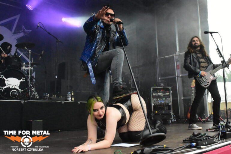 Mit Stoneman steht die derzeitige Supportband von Weimar auf der Bühne. 2004 in der Schweiz gegründet, vollzog die Band 2014 nach zehnjährigem Bandbestehen einen Stilwandel. Von englischsprachigem Dark Rock erfanden sie sich neu und sind seitdem in der Neuen Deutsche Härte zu Hause. Mit dem Album Neu! brachten sie im vergangenen Jahr schon den zehnten Longplayer auf den Markt. Diese aber mit einer neuen Besetzung, die sich nach einer längeren Pause gebildet hatte. Einzig Mikki Chixx am Gesang und Rico H mit der Produktion sind noch von der ursprünglichen Band dabei. Auf die Bühne kommt zum Intro eine Sklavin, die Mikki Chixx als Fußstütze dient. Mit viel Nebel und Goldfontänen während der Show, wissen die Schweizer auch so, wie man Blicke auf sich zieht.