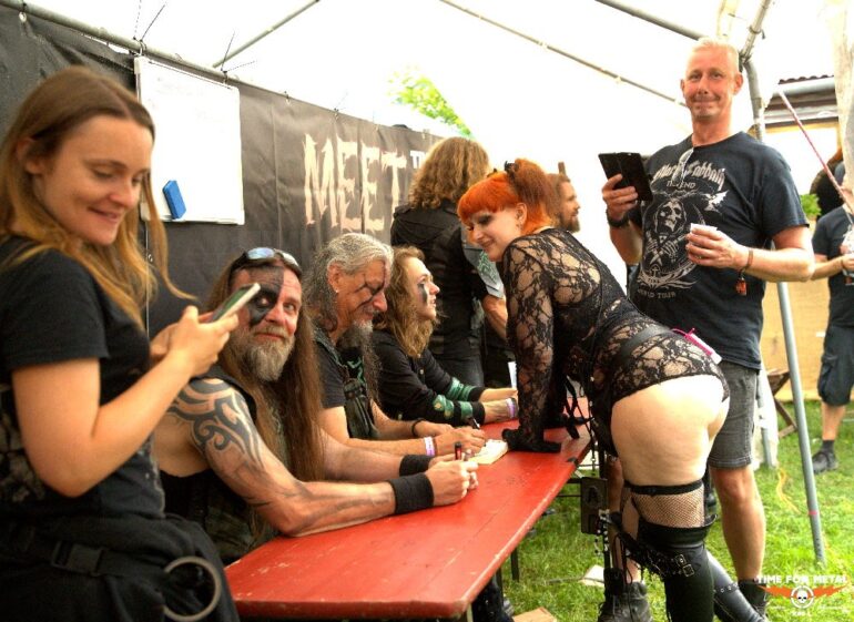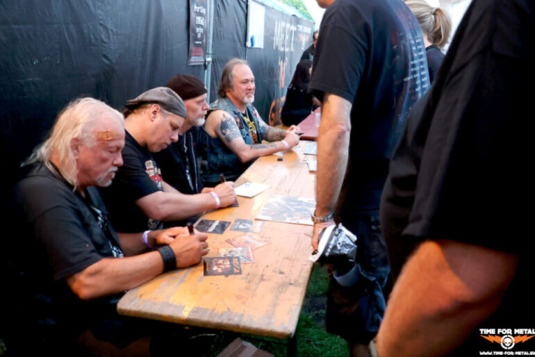 Es wird Zeit für die erste Autogrammstunde. Screamer haben den ersten Slot und sind pünktlich da. Der Stand ist aufgebaut, Papier und Stifte liegen bereit, und dann kommen bereits die ersten Fans, auch wenn die Band selbst erst um 19:45 Uhr auftritt. Die halbe Stunde Zeit wird nicht ganz ausgeschöpft, aber die nachfolgenden Strike Master stehen schon zur Abholung bereit. Da sind ein paar mehr Fans anwesend und lassen sich Bilder, das HOA-Begleitheft oder auch unsere Blankoautogrammkarten unterzeichnen. Natürlich gibt es auch Bilder, und so ist es für alle eine Win-Win-Situation. Für uns ist es hier die erste Betreuung des Meet & Greet-Angebotes, aber das läuft bereits ganz gut.