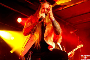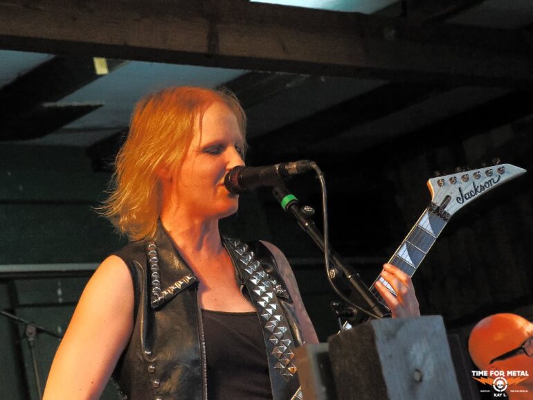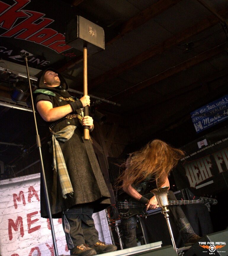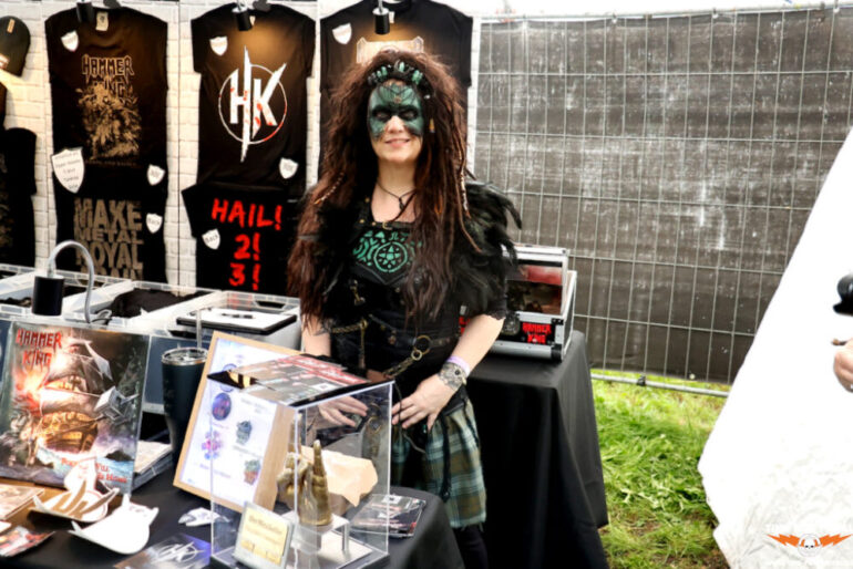 Wir verlassen den thrashigen Anfang und wenden uns einer deutschen Heavy-Metal-Keule zu – äh, nicht Keule, sondern Hammer. Der ist natürlich Bestandteil der Songs, wie im Opener Pariah Is My Name. Ich hatte diese Truppe bereits letztes Jahr beim Rockharz gesehen, und da gefielen sie mir ausgesprochen gut. Das macht Spaß, und auch die folgenden Tracks machen da keine Ausnahme. Am 15.08. kommt die neue Platte Make Metal Royal Again raus, und den Titeltrack stellen Hammer King hier schon mal live vor. Leider haben sie die noch nicht dabei, sonst hätte ich wohl zugeschlagen. Aber trotzdem hole ich mir gleich noch eine Vinyl, denn auch diese Band ist nachher bei uns am Autogrammstand zum Meet & Greet, und da lasse ich mir diese signieren. Musikalisch bewegen sich die vier Herren zwischen Power und klassischem Heavy Metal. Es gibt insgesamt zehn Songs, bevor die Jungs aus Kaiserslautern die Stage unter lautem Beifall räumen müssen. Hervorzuheben sind der überaus gut bestückte Merchstand und die dazugehörige Verkäuferin, die nicht nur für gute Geschäfte sorgt, sondern auch durch ihre passende Kostümierung ein Hingucker ist. Im Verlauf des Abends kommen wir dann auch des Öfteren ins Gespräch.
