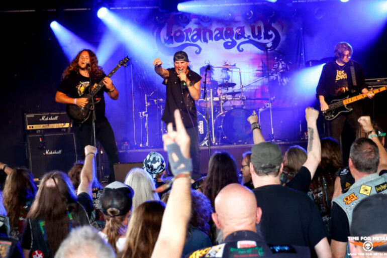 Alte Bekannte sind Space Chaser aus Berlin. Die Truppe war bereits mehrfach hier und stand 2019 als Quintett auf der Hauptbühne. Damit ist die entscheidende Veränderung von Space Chaser bereits angesprochen. Die Thrasher sind zum Quartett geschrumpft und Sänger Siggi Rudzynski hat die Band 2023 verlassen. Gitarrist Leo Schacht übernimmt jetzt den Gesang, sodass viele Tracks wie zum Beispiel Skate Metal Punks oder We Are The Night einen anderen Charakter erhalten. Die Herren liefern trotzdem noch immer einen ordentlichen Abriss, auch wenn die charakteristische Stimme von Rudzynski fehlt. Dass das Wochenende nach dem Tod einer Ikone wie Ozzy Osbourne nachwirkt, zeigt die Berliner Band. Einige Takte von Paranoid erklingen zum Ende des Sets.