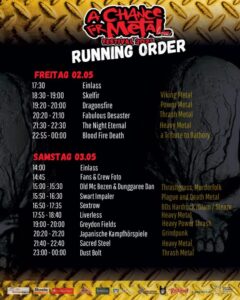 Vom 1. bis 3. Mai 2025 verwandelt sich Ochtendung wieder in eine Hochburg des Heavy Metal: Das legendäre A Chance For Metal (ACFMF) geht in die nächste Runde. Metal-Fans aus ganz Deutschland und Europa reisen an, um gemeinsam ein Wochenende voller Energie, Musik und Gemeinschaft zu erleben – begleitet von einer Auswahl erstklassiger Bands.