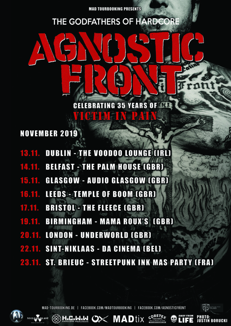 Die legendären NYHC-Pioniere Agnostic Front kommen im November erneut auf Tour – dieses Mal mit vornehmlich im Vereinigten Königreich. Auf den diesjährigen Shows wird der Fokus auf den Feierlichkeiten zum 35jährigen Jubiläum ihres Klassikers »Victim In Pain« liegen.