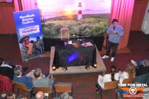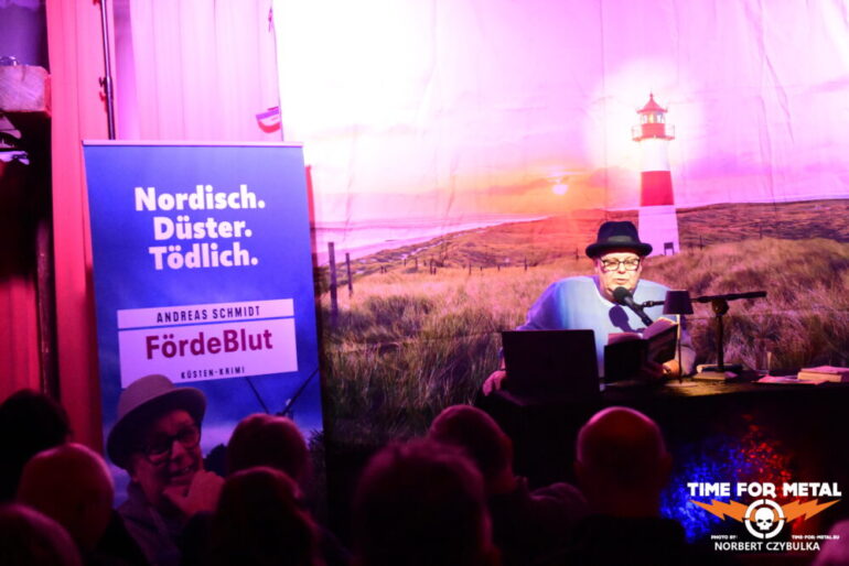 Die Lesung im Leck-Hus wird dabei selbst zum inszenierten Erlebnis. Schmidt beschränkt sich nicht auf klassisches Vorlesen, sondern verbindet einzelne Kapitel mit einem atmosphärischen Sounddesign. Dezente Musik, Schritte im Dunkeln oder aufheulende Motorengeräusche verstärken die Spannung und erinnern bewusst an die Hörspieltradition populärer Reihen wie Die Drei ??? oder TKKG. Die abgedunkelte Bühne verwandelt den Saal zeitweise in einen akustischen Tatort.