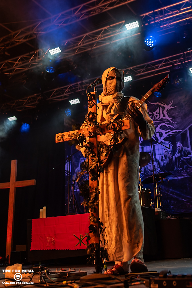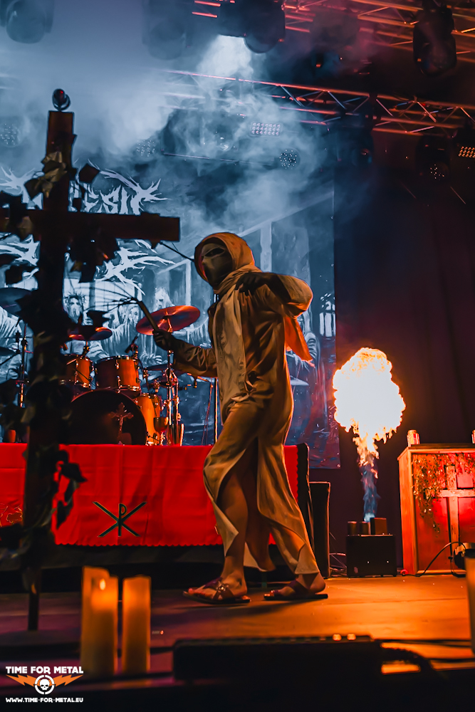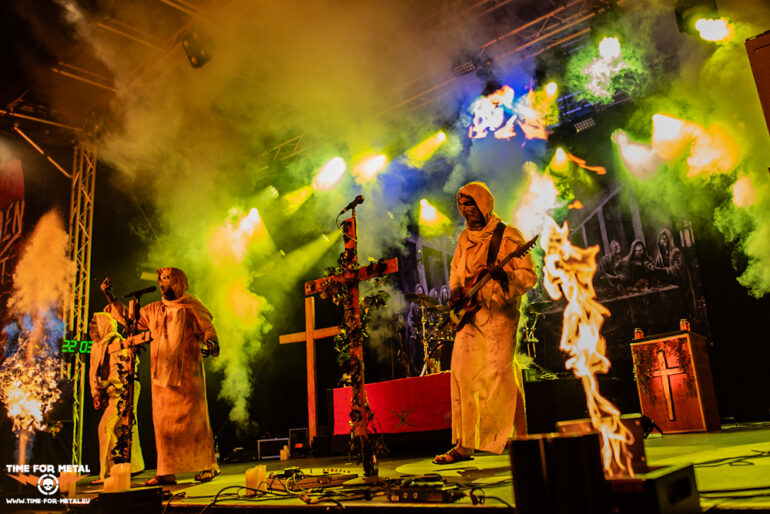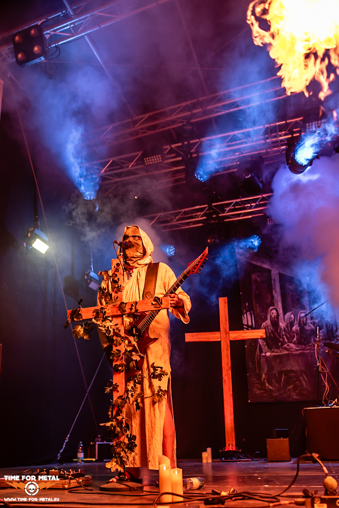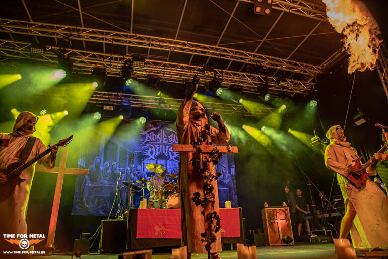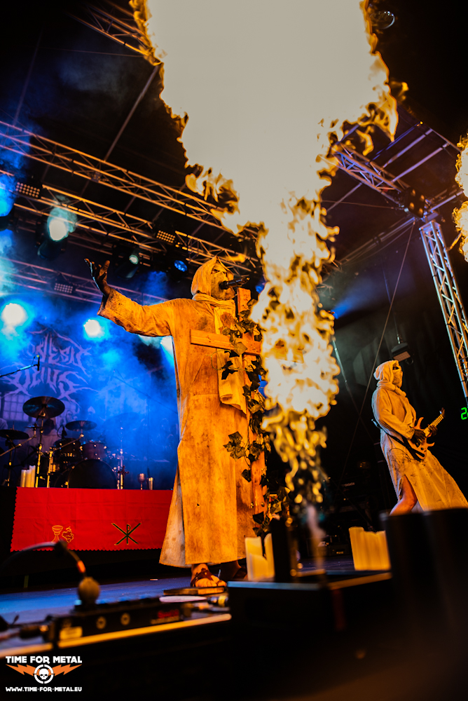 Mittlerweile hat die Nacht Einzug genommen und Non Est Deus setzen alles daran, die Dunkelheit zu durchdringen. Mit meterhohen Flammen setzen sie die Baden In Blut Bühne in Brand, während sie ihren kompromisslosen Black Metal auf die Gäste abfeuern. Die Musiker stehen maskiert in Mönchgewandung auf der Bühne und Kreuze zieren das Bühnenbild. Alles wirkt stimmig, denn das Projekt kennt nur eine Thematik: Religion! Und das nicht im positiven Sinne. Mastermind Noise, der sich auch für Kanonenfieber verantwortlich zeigt, kritisiert in seinen Texten eben jene als Wurzel von Gewalt und Ausgrenzung, während er eine brennende Bibel in der Hand hält oder sich selbst geißelt.
