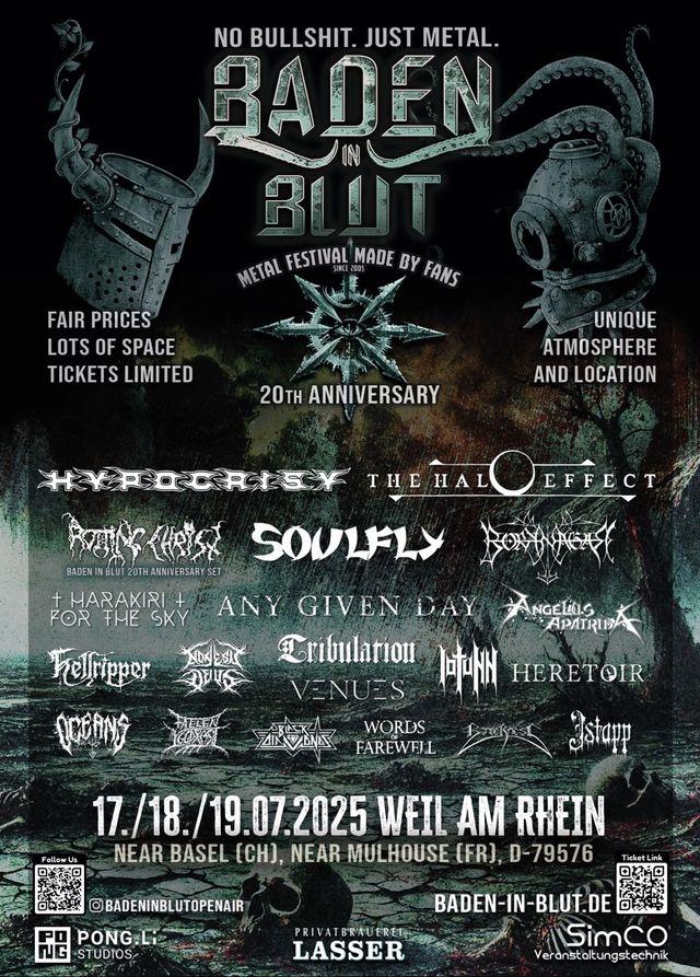 Musikalisch wird das 20. Baden In Blut Open Air von der Band eröffnet, die vorab nur als Very Special Guest angekündigt wurde und die bereits die erste Ausgabe im Grütt eröffnet hat. Die Rede ist von Destination:Hell. Die aus Lörrach stammenden Opener sind eigentlich seit über zehn Jahren nicht mehr aktiv, haben sich jedoch extra für die Geburtstagsfeier des BiB noch mal im Proberaum zusammengefunden, um etwas Nostalgie aufleben zu lassen.