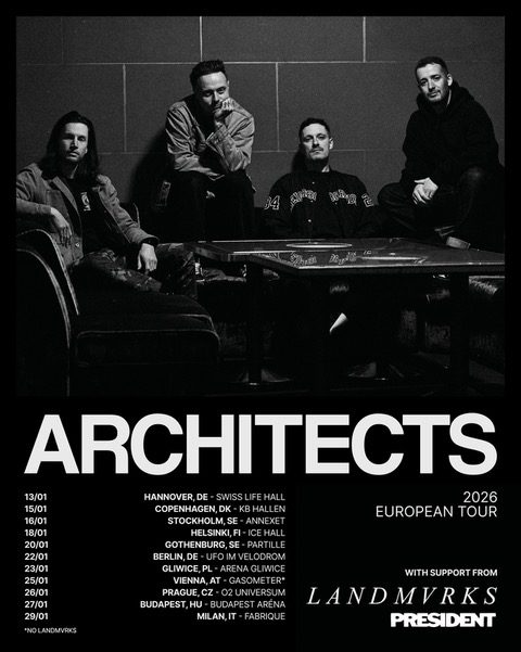 Nach dem weltweiten Erfolg ihres aktuellen Albums The Sky, The Earth and All Between und der Ankündigung einer UK & EU Headline-Tournee für Oktober, können wir uns ab heute darüber freuen, dass Architects auch im kommenden Januar für einige Shows nach Deutschland und Österreich kommen werden. Auf dieser Tour wird die Band von weiteren Hochkarätern, nämlich Landmvrks und President unterstützt.