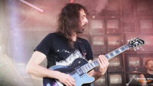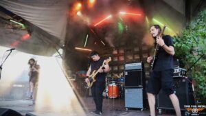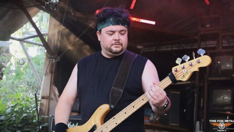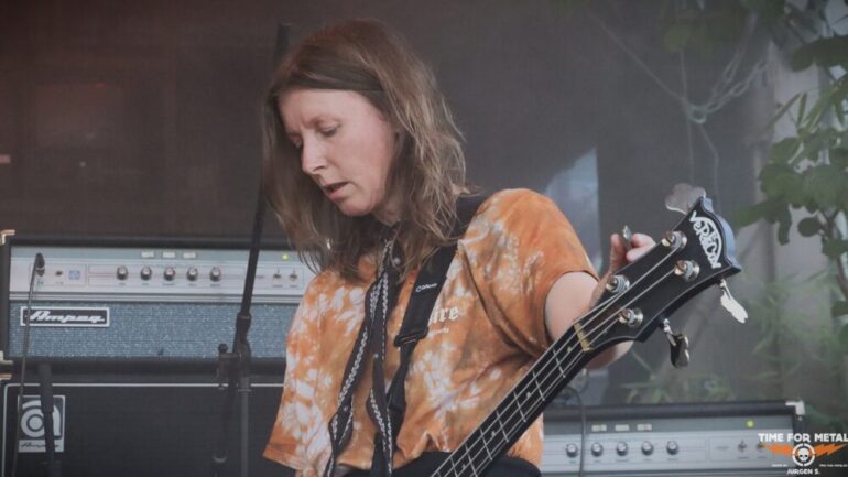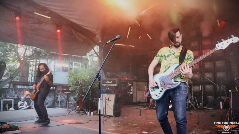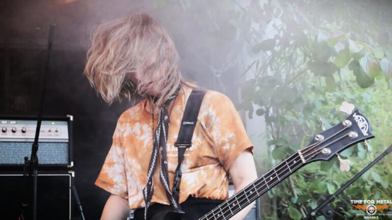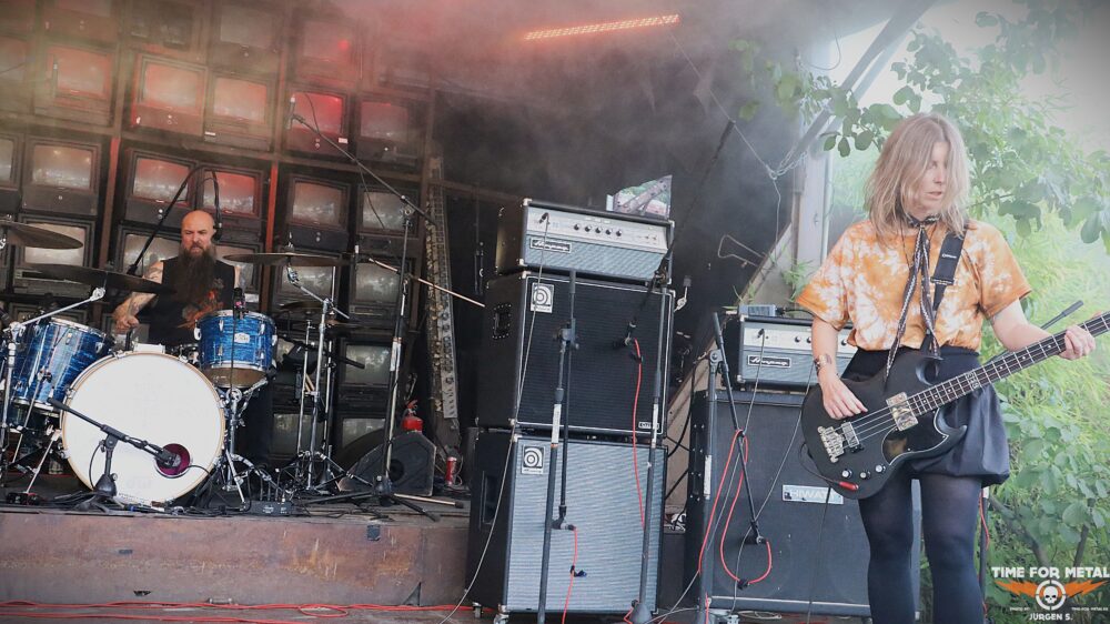Nach der Umbauphase erleben wir die kraftvolle Energie des Berliner Duos Grin, das in der Stoner-Szene längst einen festen Platz hat. Sabine steht vorne auf der Bühne, einsam und doch so präsent, wie eine Hexe, die mit ihrer Bassgitarre magisch den Raum erfüllt. Jan im Hintergrund treibt das Schlagzeug mit voller Wucht, während seine Vocals über die Bühne fließen und die Atmosphäre aufladen. Das Duo, bekannt für ihre intensiven Live-Auftritte auf Festivals wie dem Freak Valley oder dem Hoflärm, präsentiert heute sein hochgelobtes Album Acid Gods, das dieses Jahr über The Lasting Dose Records erschienen ist. Grin präsentieren sich heavier denn je, voller roher Kraft und unverfälschtem Sound. Während der Performance erklingen Songs wie Drag Me Down, Nocturno, Black Dye und das abschließende Heavy Dew – alles Stücke des neuen Albums, die die Zuhörer in eine dunkle, schwere Welt eintauchen lassen. Grin verzichten auf Soundsamples und setzen stattdessen auf pure, raue Energie, die direkt ins Herz trifft. Die Performance ist ein echtes Highlight, das die rohe Kraft und die unverfälschte Leidenschaft dieses Berliner Heavy-Psych-Doom-Duos spürbar macht. Intensiver Klänge, die noch lange nachhallen!