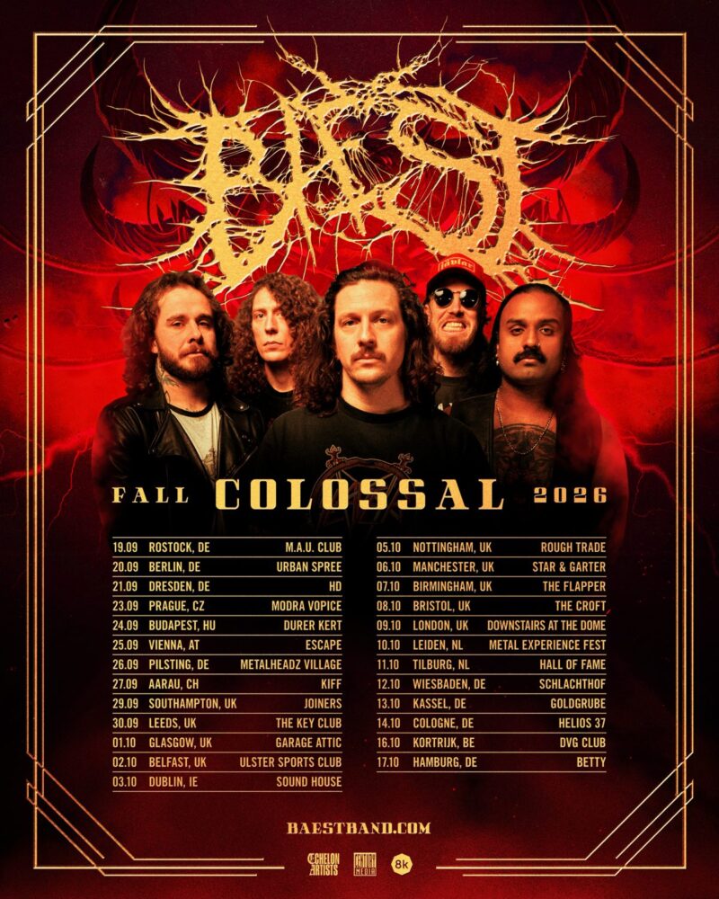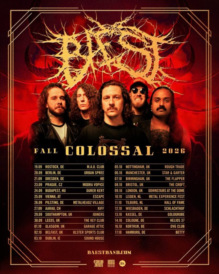 Die dänische Death-Metal-Band Baest kehrt diesen Herbst mit ihrer europäischen Headline Tour Fall Colossal 2026 auf die Bühnen zurück und bringt ihre energiegeladene Live-Performance nach Kontinentaleuropa, Großbritannien und Irland.