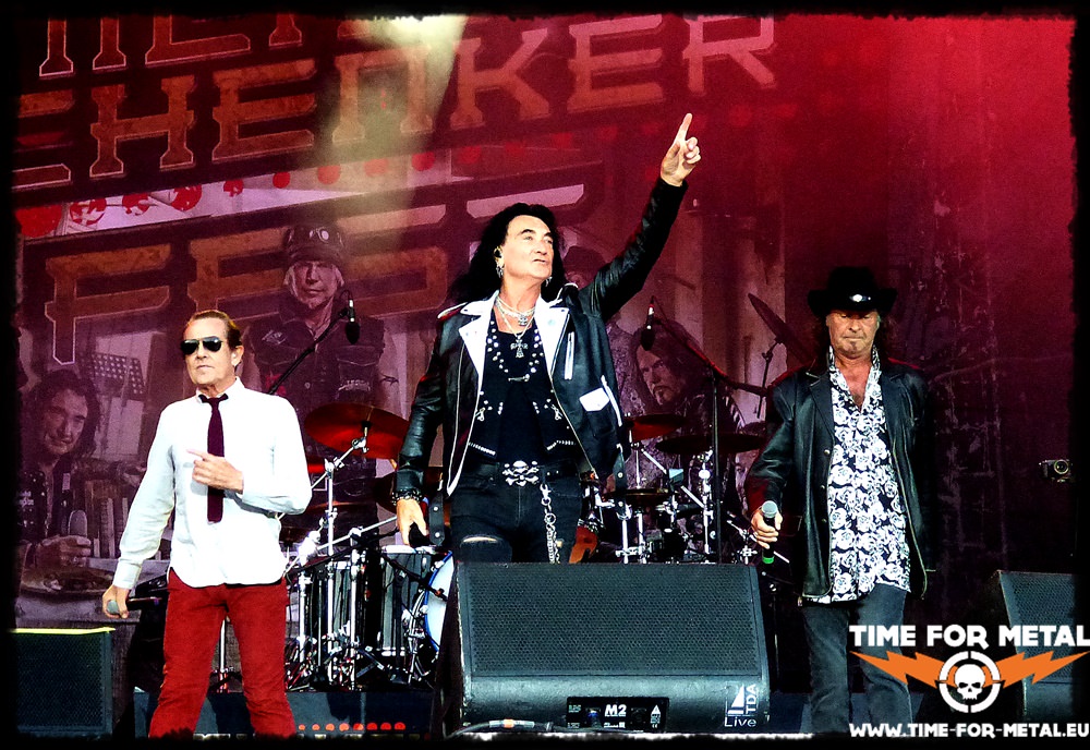 Beim nachfolgenden The Night Flight Orchestra-Auftritt verbringe ich die ersten drei Songs im Fotograben, aber ehrlich gesagt, so wirklich brauche ich die Band um Soilwork-Sänger Björn Strid nicht. Meine Begeisterung hielt sich schon arg in Grenzen, als die Truppe vor einigen Monaten bekannt gegeben wurde. Es gelang mir bis heute nicht, diese zu steigern. Mit den Songs bin ich zudem so rein gar nicht vertraut, jedoch bewegt sich hier alles irgendwo im Hardrock und AOR-Umfeld. Die beiden bekannten, pummeligen und gewohntermaßen in pink gekleideten Stewardessen wurden heute ganz nach vorn an den Bühnenrand verfrachtet und fielen eigentlich nur durch ihre gelegentlichen Wink-Attacken und übermäßigen Sekt-Genuss auf, denn immer wieder füllten sie ihre Gläser nach und prosteten sich zu. Auch Strid wird zwischendurch mal mit einem Schlückchen versorgt …, na dann, weg mit der Kacke! Nun gut, mein Ding ist das alles nicht und mit Metal hat das Geschehen auf der Bühne auch so rein gar nichts zu tun, aber das ist eben nur meine ganz persönliche Meinung. Dem Publikum gefällt es offenbar, denn in den ersten Reihen ist Party angesagt. Tatsächlich sind die Songs partytauglich und so ist es nicht weiter verwunderlich, dass im Infield sogar eine Polonaise entsteht und bei einigen Partygästen tatsächlich die Löcher aus dem Käse fliegen. Passend dazu schaut nun sogar die Sonne mal in Balingen vorbei. Auffällig auch, auf der Bühne ist nicht Arch Enemy-Bassist Sharlee D`Angelo aktiv, sondern der aktuelle Soilwork-Live-Bassist Rasmus Ehrnborn. Offenbar hatte D`Angelo keine Lust auf großen Reisestress, da er mit seiner Hauptband an diesem Wochenende noch in Norwegen auf die Bühne muss. Die Schweden passen so gar nicht ins restliche BYH-Billing, aber die Leute gehen richtig steil. Nur mich kann die Flugcrew nicht so richtig mitnehmen auf die Reise und so gehe ich erst mal etwas zwischen die Kiemen schieben.