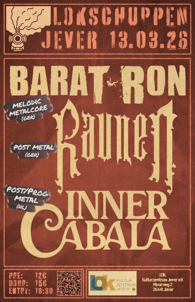 Ebenfalls dabei: Raunen aus Wilhelmshaven, deren Sound die raue Küste widerspiegelt. Das Trio verbindet Post- und Black Metal mit Hardcore-Einflüssen und erschafft eine Atmosphäre von Weite, Melancholie und roher Intensität. Ihre erste EP Immerfort legte 2024 den Grundstein für ihren kompromisslosen Stil.Aus Groningen reisen Inner Cabala an. Die international besetzte Post-Metal-Band kombiniert Einflüsse von Mogwai, Leprous und Brutus und vereint Post- und Prog-Metal mit emotionalen Balladen.