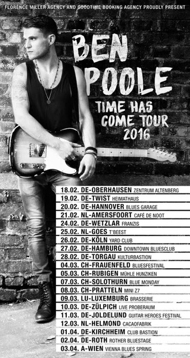 Im Frühjahr 2016 kommt Ben Poole mit seiner Band endlich wieder auf Europatour und wird dem Publikum die Songs seines zweiten, brandneuen Studioalbums „Time Has Come“ (Veröffentlichung am 01.04.2016 auf Manhaton Records) live präsentieren. Ein Konzerthighlight, welches jeder Blues(rock)fan besser nicht verpassen sollte!