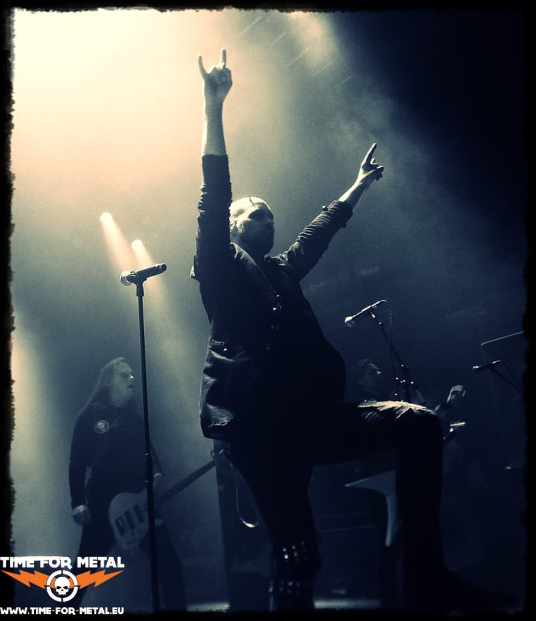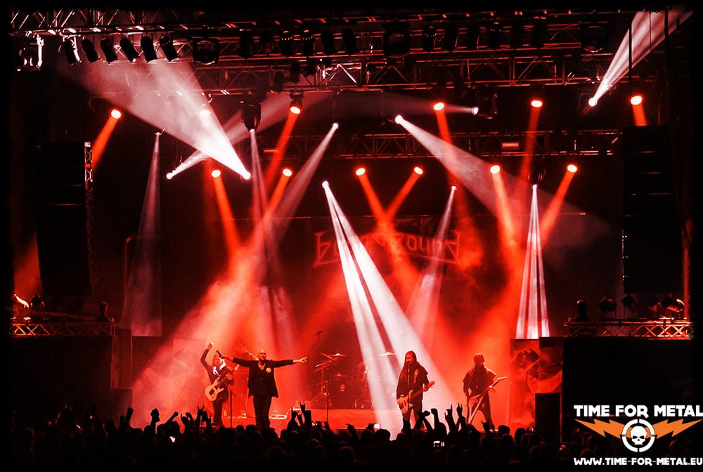 Nun zieht sich die Umbaupause etwas länger hin, doch dafür füllt sich der Raum vor der Bühne noch einmal zusehends. Es ist schon eine Weile her, dass ich Bloodbound vor zwei Jahren auf dem Metalacker Festival gesehen habe. Zwischenzeitlich haben die Jungs aus dem nordschwedischen Bollnäs mit War Of Dragons (2017) und Rise Of The Dragon Empire vor wenigen Tagen zwei weitere starke Power Metal Alben veröffentlicht. Und dennoch, bei Bloodbound denkt der geneigte Metaller zunächst an den Nackenbrechersong der Genrekollegen von Hammerfall, obwohl der erst 2005 veröffentlicht wurde, ein Jahr nachdem Gitarrist Tomas Olsson und Keyboarder Fredrik Bergh die gleichnamige Band gründeten. Als Opener hätte ich auf einen Song vom aktuellen Album gewettet, aber überraschenderweise steigt man mit Battle In The Sky aus 2017 stark ein und Schlagwerker Daniel Sjögren darf gleich zu Beginn ordentlich seine Fußmaschine bedienen. Angesagt sind nun natürlich melodische Power Metal Songs mit starkem Hang zu Fantasythemen. Der charismatische Frontmann Patrik Johansson sucht zu Beginn direkt den Kontakt zum Publikum und grinst frech, während seine kleinen angeklebten Hörnchen blutrot schimmern. Der Mann ist die gute Laune in Person und der klare Sympathieträger der Band. Gute Laune gibt es auch mit dem nächsten Song, Satanic Panic, einer Zeitreise ins Jahr 2014. Der Song ist immer wieder ein Stimmungsgarant bei den Konzerten, er setzt sich sofort zwischen den Ohren fest und sorgt auch heute für geballte Fäuste und wippende Schädel. Auch wenn die stimmlichen Vergleiche mit Oberpriester Rob Halford langsam ausgelutscht sind, sie sind nicht von der Hand zu weisen. Die Band war nie wirklich innovativ und wahnsinnig eigenständig, hat aber ein Händchen für Hymnen, die alle irgendwo zwischen Sabaton, Powerwolf, Hammerfall, Stratovarius und Edguy angesiedelt sind und auch immer mal mehr oder weniger an diese erinnern. Mit Stand And Fight gleitet man dann auch in Sabaton Gefilde, deren Panzer man förmlich über die Bühne rollen hört. Die Songs sind keinesfalls schlecht, fallen in die Kategorie leicht gestrickte Mitmach-Metal-Partyhymnen, aber müssen halt ohne eigene Bloodbound Trademarks auskommen. Patrik Johansson ist sichtlich bemüht, die Maschinerie in Gang zu halten, bewegt sich viel und hampelt mit beiden Armen herum, jedoch steht er damit alleine da. Die Saitenfraktion in Form von Gitarrist und Gründungsmitglied Olsson, Gitarrist Henrik Olsson und Bassist Anders Broman, steht rechts und links von ihm und hat, abgesehen vom Sound, nicht viel beizutragen. In The Name Of Metal lässt dann wieder deutliche Hammerfall / Accept-Parallelen erkennen, aber die Nummer macht live dennoch mächtig Spaß und wird auch in der Konzertfabrik lautstark mitgegröhlt. Mit dem epischen Slayer Of Kings folgt der erste Song des nagelneuen Albums Rise Of The Dragon Empire, welches ich bisher noch nicht gehört habe. Der Song passt sich gut ein und macht auch wieder Spaß, aber auch hier erfindet man das Rad gewiss nicht neu. Die Keyboardmelodie ist geil, aber der typische Bloodbound-Touch, der die Band zu etwas einzigartigem macht, ist auch hier nicht zu finden. Dynazty zuvor hätten ihn auch spielen können. Keyboarder Bergh sticht hier mehr hervor wie die beiden Gitarristen, die für mich hier heute austauschbar sind. Die Band kommt gut an und sorgt für ordentlich Feierlaune im Publikum, doch wenn ich an meinen letzten Gig auf dem Metalacker zurückdenke, so bin ich heute etwas enttäuscht. Daran ändert auch das unauffällige War Of Dragons oder das einfach gehaltene neue Miptempo-Stück Skyriders And Stormbringers nichts. Mit On The Battlefield geht es dann weit in die Vergangenheit zurück, zum Debüt Nosferatu, das noch von Urban Breed (ex-Tad Morose) eingesungen wurde. Der Song mit heftiger Iron Maiden-Schlagseite gefällt und ist ein Highlight des bisherigen Auftritts. Gerade hier zeigt sich nun auch, das Sänger Patrik Johansson ein echter Hauptgewinn für die Schweden ist, der mächtig frischen Wind in den Klassiker bringt. Stormborn dürfte dann wieder allen Hammerfall Fanatikern gefallen, während die folkigen Elemente aus Silver Wings heute etwas hervorstechen. Eins haben heute aber fast alle Songs gemeinsam, es geht fast durchgängig mit durchgetretenem Gaspedal voran, was vor allem die Headbanger freut. Nicht wenige dürften morgen früh mit Nackenschmerzen aufwachen und sich fragen, welches Pferd sie denn da getreten hat. Mit Fallen Heroes nimmt man dann aber doch mal etwas Tempo raus und gibt etwas Zeit zum Durchatmen, was im Publikum dringend nötig ist. Auf der Bühne ist das eher nicht nötig, denn mal abgesehen von Frontmann Johansson und Drummer Sjögren macht die Band immer noch den Eindruck, als hätte man sich im Laufe der Tour verausgabt und müsse sich heute etwas ausruhen. Der Gesang des Hörnchenträgers entschädigt aber für vieles, er singt mit viel Ausdruckskraft und reizt die Refrains bis zum letzten aus und auf mit den Höhen kommt der Mann einwandfrei klar, wie das hymnische Moria dann zeigt. Dann wird es jedoch wieder Zeit, die Luftgitarren auszupacken, denn mit dem simpel stampfenden Metalheads Unite kommt die nächste Abrissbirne daher. Zum Ende hin werden im Publikum noch einmal die letzten Kräfte mobilisiert und der Song wird aus unendlichen Kehlen mitgegröhlt. Mit Dragons Are Forever wird sofort hymnenmäßig nachgelegt, doch damit ist das offizielle Set dann beendet. Im Zugabenblock gibt es dann den Titeltrack des aktuellen Album Rise Of The Dragon Empire auf die Ohren und zum Rausschmeißer wird Nosferatu erkoren, welches zum Schluss noch einmal richtig gefeiert wird.