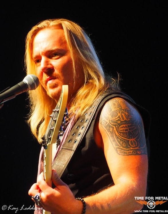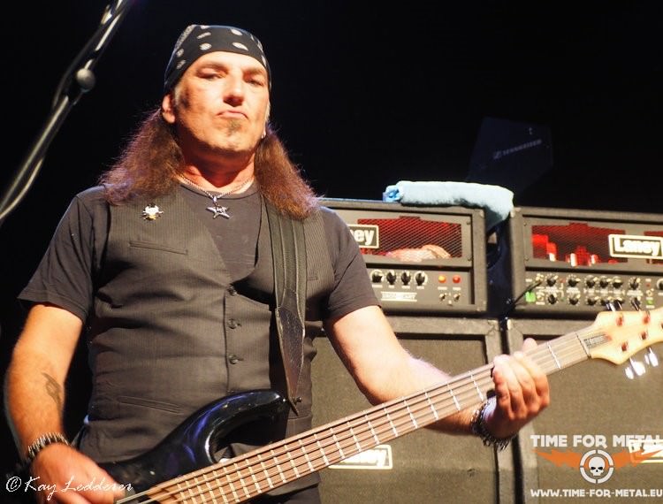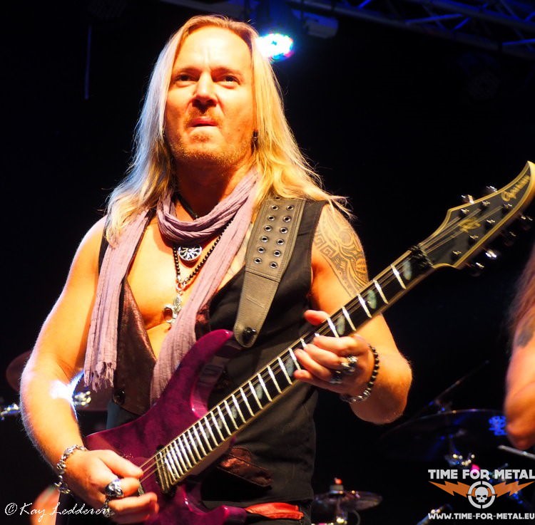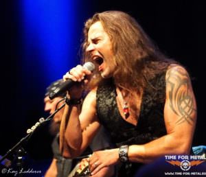 Bereits hier werden schon mal fotografengerechte Posen gezeigt, die Gitarre effektvoll geschwungen und auch der böse Blick klappt schon ganz gut. Mit Never Mind geht’s weiter. Der Song ist vom 87er-Album Fireworks, aber für den erst seit zwei Jahren bei Bonfire agierenden Sänger keine Hürde und so meistert er das souverän. Das Publikum ist noch recht verhalten, klatscht aber brav am Ende des Songs. Die Norddeutschen brauchen halt immer etwas länger, und so wird es im Laufe des Abends noch besser. Immer wieder setzt sich Frank Pané in Szene und brilliert an der Leadgitarre. Hans Ziller, recht ruhig auf seiner Seite, ist aber an der Gitarre ebenfalls virtuos. So entwickelt sich auch hier öfters mal ein gutes Duell der beiden Gitarristen. Alexx Stahl erklärt dann aber, dass der Hans gerade noch an einer Erkältung rumlaboriert und trotzdem hier steht, um zu spielen. Alle Achtung. Es geht musikalisch noch weiter zurück. Don’t Touch The Light von 1986 ist dran. Aber der Song erscheint weder angestaubt noch altertümlich. Bassist Ronnier Parkers unterstützt gesanglich und auch Frank und Hans sind häufig am Mikro zu finden. Dadurch bekommen die Songs noch mehr Dynamik. Das Publikum taut langsam auch auf und so wird auch schon mal laut mitgeklatscht. Trotzdem bleibt der Platz vor der Bühne recht frei, was den wenigen Pressevertretern zugutekommt. Das Licht ist ordentlich und auch der Sound ist top, das haben sie hier mal wieder gut abgemischt.
