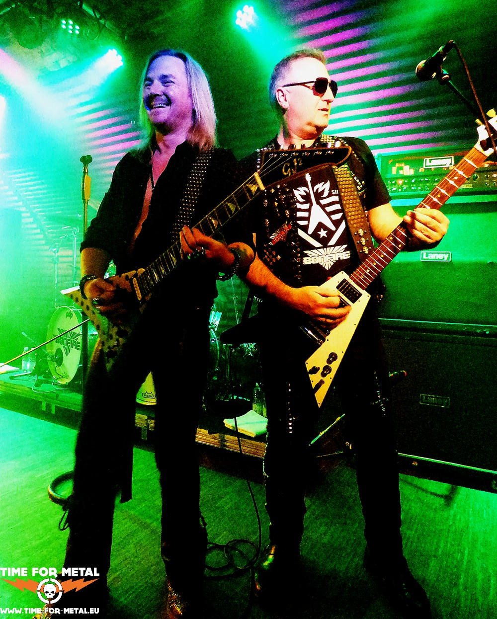 Als Supportact wurden die Aachener Heavy Rocker Grey Attack verpflichtet, die dann auch pünktlich um 20:00 Uhr die Bühne betreten und ohne ein weiteres Wort loslegen. Das Jazzhaus ist an diesem Abend nicht ausverkauft, aber mit ca. 100 Besuchern einigermaßen gut gefüllt. Das Quartett aus Aachen feuert gleich zu Beginn einige Rocksalven ins Publikum, als will man gleich mal klarstellen, dass man nicht einfach nur der Opener des Abends ist. Mir war die Band, die in der Vergangenheit schon mit Rockikonen wie z.B. Anvil, Y&T, oder Loudness unterwegs war, bisher gänzlich unbekannt, doch die melodischen Songs, geprägt durch die imposante Röhre von Leadsänger und Gitarrist Grey Charlez, gehen direkt ins Ohr. Die Band findet schnell Zugang zum Publikum in den ersten Reihen, welches aus Altrockern und Headbangern in Kutte besteht. Handgemachter Rock mit satten Gitarrenriffs und kernigen Schlagzeugbeats funktioniert eben immer, so auch heute Abend, wo das überwiegend Ü-40-Publikum gut mitgeht. Die Songs stammen mit Ausnahme von 2-3 Tracks alle vom aktuellen Album Grains Of Sand, das die Band erst kurz vor der Bonfire – Tour fertiggestellt hat. Die bekannten, schwammigen Soundprobleme im Jazzhaus bekommt man auch heute nicht so richtig in den Griff und das Licht ist auch gewohnt schlecht, dennoch spielt die Band auf hohem Niveau und macht einen guten Job. Spielfreude und Bock auf Rock sind immerzu spürbar. Nach ein paar lobenden Worten an das Freiburger Publikum verabschiedet sich das Aachener Quartett nach gut 45. Spielminuten.