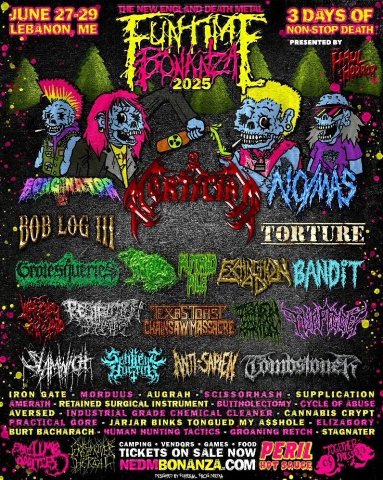 Bonginator haben sich intensiv mit der Organisation vom New England Death Metal Fun Time Bonanza 2025 Festival beschäftigt, bei dem die legendären Mortician als Headliner gesetzt sind und totale Verwüstung sowie ein headbangendes Nacken-Trauma nach drei Tagen Nonstop-Moshing versprechen. Das Event findet vom 27. bis 29. Juni 2025 in Charleez Hill in Lebanon, ME, USA statt.