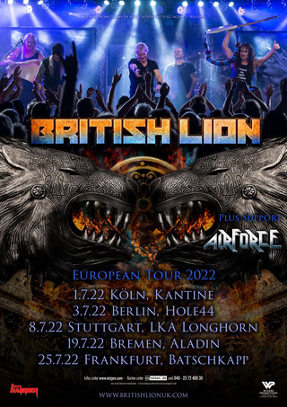 Der Heavy Sommer rückt näher und somit auch die Rückkehr von British Lion. Das Nebenprojekt von Iron-Maiden-Bassist und -Gründer SteveHarris, wird im Sommer 2022 eine zehn Termine umfassende europäische Headline-Clubtournee absolvieren. In Deutschland sind British Lion jeweils am Vorabend der fünf Iron Maiden-Shows in Deutschland in den Clubs der Stadt live zu erleben. Das ultimative Live-Package für alle Maiden– und Heavy-Fans. Support in Deutschland ist die britische NWoBHM-Band Airforce.