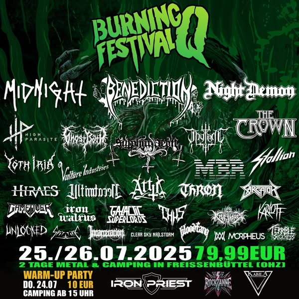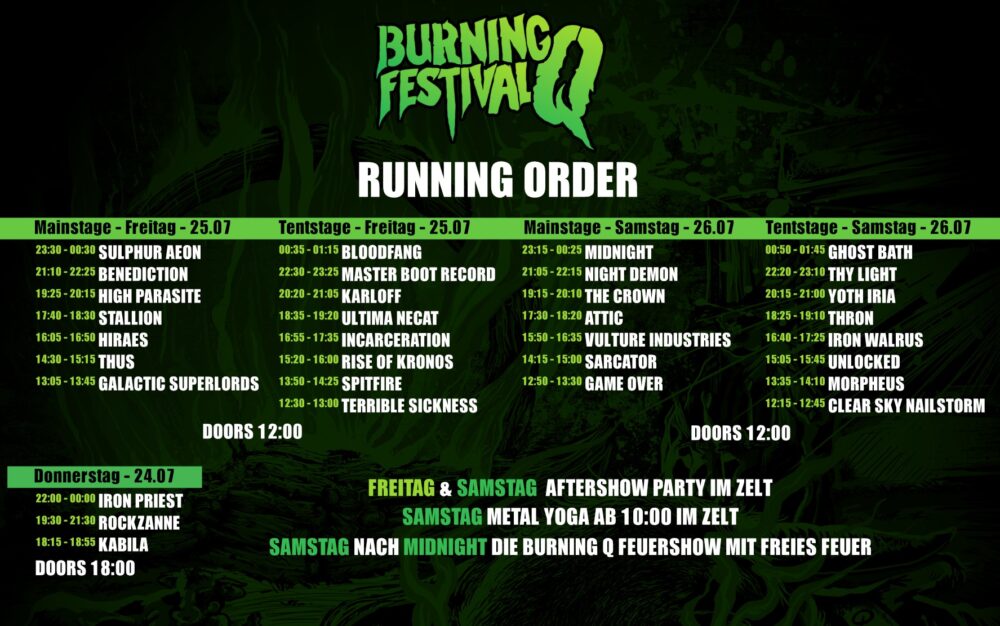Am 25.07. und 26.07.2025 verwandelt sich Freißenbüttel erneut in ein Mekka für Metal-Fans: Das Burning Q Festival kehrt zurück – lauter, härter und vielfältiger denn je! Mit der Bekanntgabe der Running Order steigt die Vorfreude auf eine explosive Mischung verschiedenster Metal-Genres, die das Open Air zu einem unvergesslichen Erlebnis machen wird.