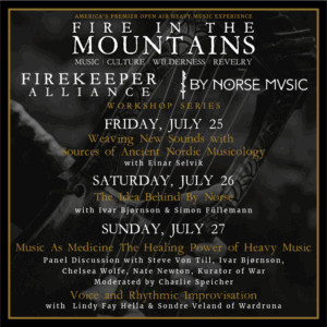 Die Workshops sind ein Bestandteil des Nordic Night Showcase, einem speziellen Programm beim Fire In The Mountains, das von By Norse, der Firekeeper Alliance, Wardruna und Fire In The Mountains organisiert wird. Die Veranstaltungen konzentrieren sich auf Musik, Natur und Kultur als gemeinsame Grundlage sowie auf Musik als Heilmittel in der modernen Welt und ihren Herausforderungen. Der Nordic Night Showcase wird zudem Auftritte von Lindy-Fay Hella & Dei Farne und BardSpec beinhalten.