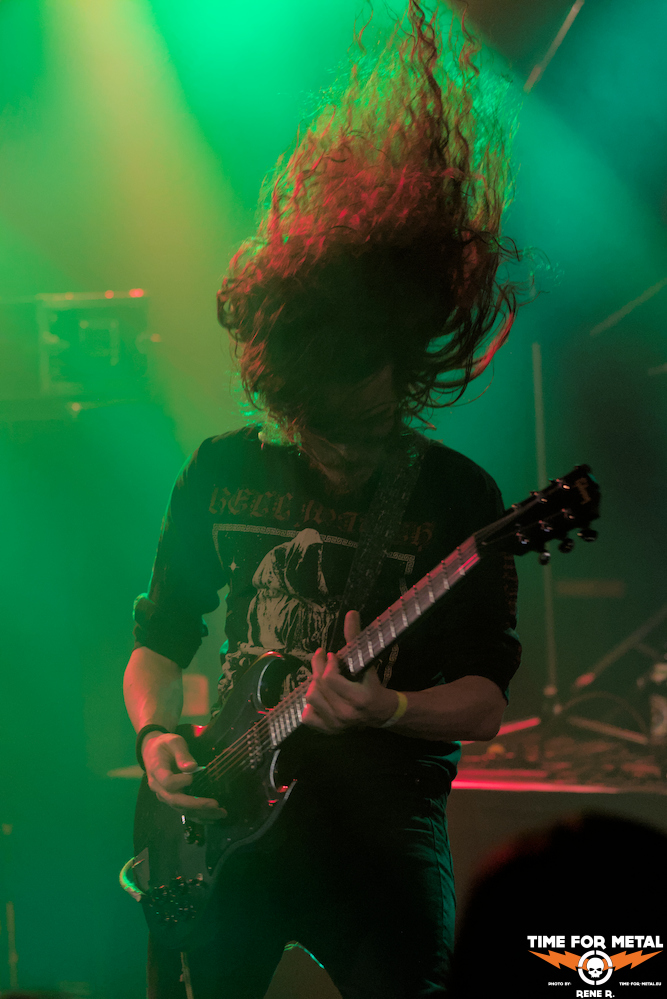 Gerade so pünktlich zum Auftakt um halb sechs ins Hansa gestolpert, erlebe ich zunächst das, was sich eigentlich immer abspielt zu Beginn eines langen Konzertabends: der Raum vor der Bühne ist so gut wie leer und es sieht so aus, als wäre der Vorverkauf ziemlich schlecht gelaufen. Doch – und auch das gehört quasi zur Tradition – kurz nachdem das Licht erlischt, der Nebel von der Bühne wabert und die ersten Töne erklingen, kommen plötzlich aus allen möglichen und unmöglichen Ecken die schwarzen Gestalten angelaufen und auf einen Schlag ist Action im Saal. Beileibe nicht in kompletter und finaler Stärke, reicht das initiale Aufgebot jedoch völlig aus, um Hidas einen gebührenden Empfang zu bereiten.