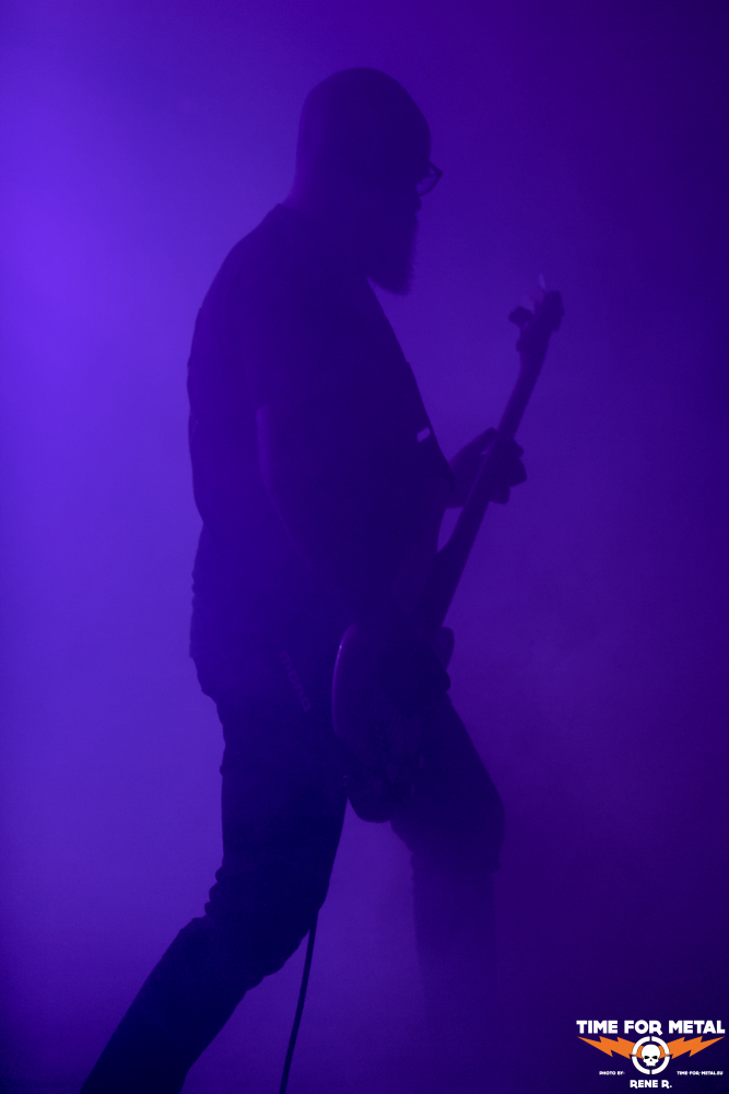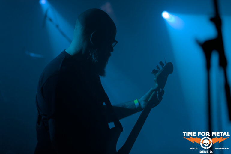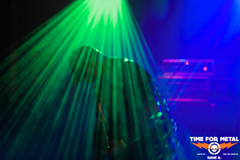 Kaum sieht man die eigene Hand vor Augen, so emsig sind die Nebelwerfer bei der Sache. Man erahnt das Münchner Trio irgendwo im Gewaber aus blauem und rotem Licht, das rein instrumental gehaltene Doom- und Stonergedröhne überrascht musikalisch kaum, geht aber absolut klar und zudem gut ins Ohr, repetitiv und hypnotisch kann man wunderbar die Augen schließen und sich in die Soundwogen legen, viel zu sehen gibt’s aus genannten Gründen sowieso nicht. Wir hören Dopedynger, Pendulum, Tiefe und Chamber. Anscheinend ist das Versteckspiel im verdampfenden Fluid Pflicht für den Opener – ähnlich sah es auch schon anno 2023 bei Hæresis aus. Ein bisschen geht die filigrane Finesse der monolithischen Melodien in der Grobschlächtigkeit der PA (und vielleicht auch in meinem Gehörschutz) verloren, aber dafür kann man sich ja bei Bedarf die Platte noch einmal in Ruhe zu Gemüte führen. Die Reihen füllen sich mehr und mehr, und der zweite Auftritt des Abends rückt näher.
