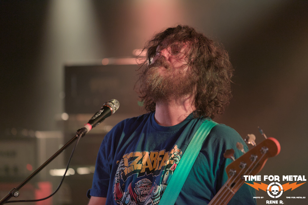 Kurz nach halb acht geht’s dann noch ein Stück weiter südlich auf der Landkarte und Tons aus Turin klettern auf die Bühne. Dass diese Doom-Maschine wahrscheinlich nicht nur mit Kohle heizt, lassen schon die bunten Klamotten von Frontmann Paolo erahnen, und auch die Songtitel transportieren eindeutig-zweideutigen Subtext. 99 Weed Ballons – noch Fragen? Der Sound riecht und schmeckt jedenfalls eindeutig nach grünem Gebrösel, ein bisschen Electric Wizard, nur ohne okkulte Versatzstücke, dazu Paolos Gekeife, viel Wah-Wah und mächtige Drums. Kann man definitiv so machen, die Menge vor der Bühne feiert es jedenfalls heftig. Auch den Mann an den Drums hält es irgendwann nicht mehr auf seinem Hocker, uns so sprintet er nach vorn, um sich kurz gebührend abfeiern zu lassen. Ein atemloser Gig wie ein Rausch.