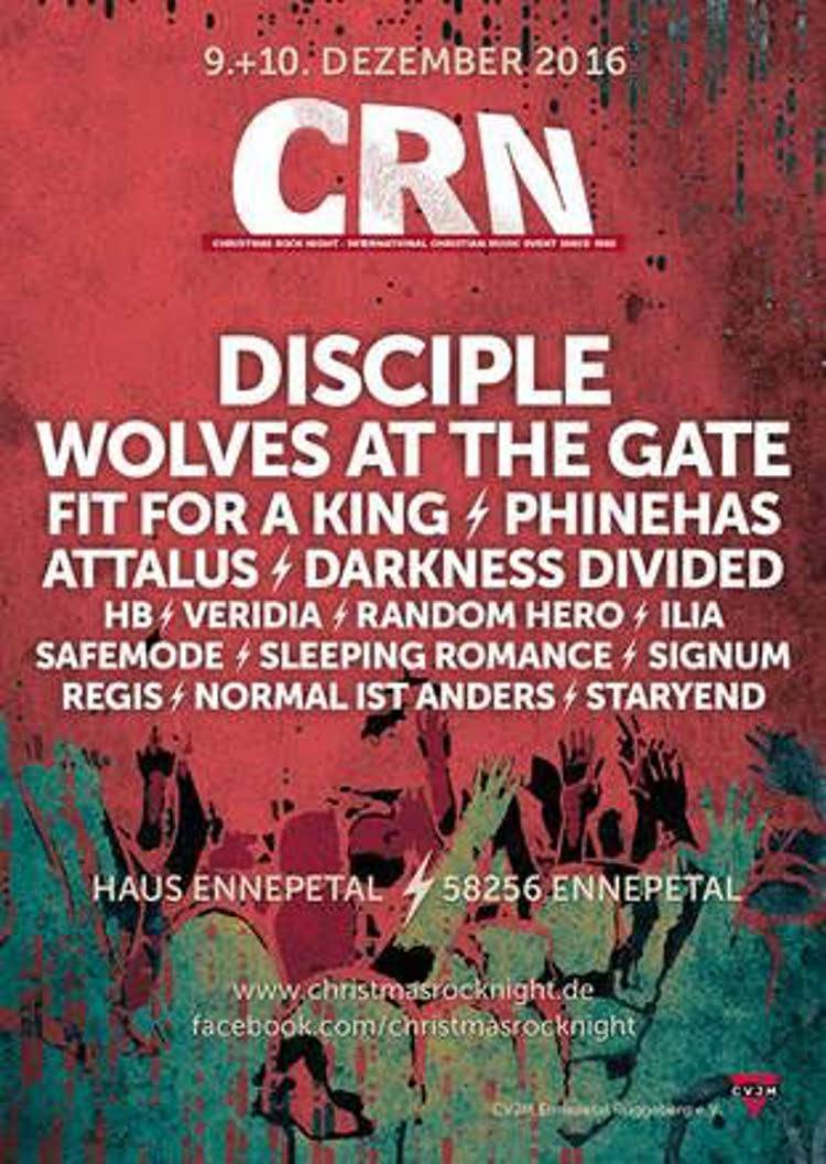 Auf der CRN 2016 am 9. und 10. Dezember sind dabei: Phinehas, Fit For A King, Wolves At The Gate, Disciple, Attalus, Darkness Divided, HB, Veridia, Signum Regis, Safemode, Random Hero, Ilia, The Sleeping Romance, Normal Ist Anders und Staryend
