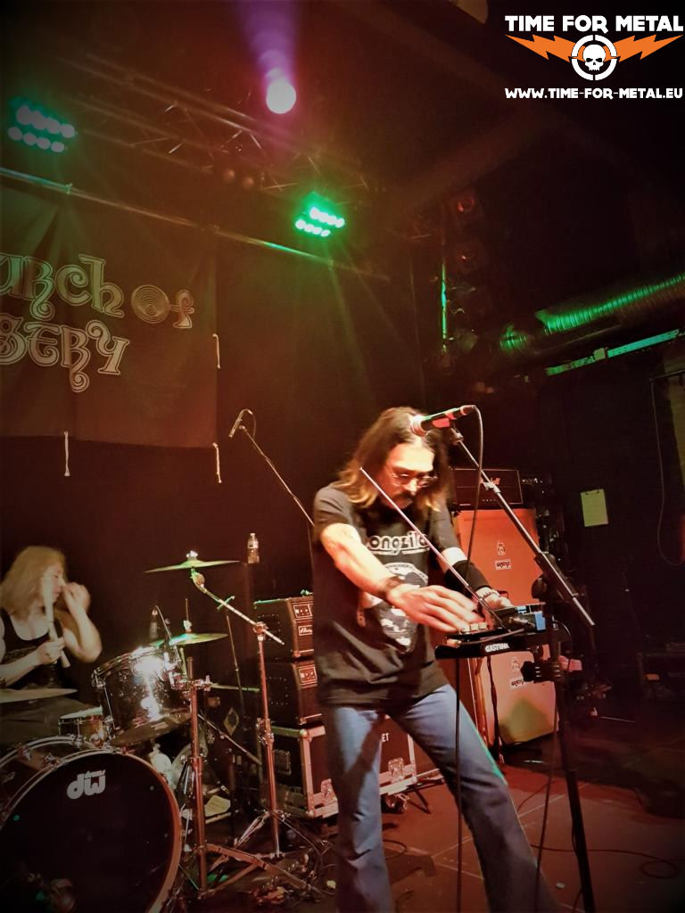 Zur vorgerückten Stunde dann endlich der Kirchgang. Die ausgelassenen Fans der vorangegangenen Band haben nun endlich die Möglichkeit zu beichten. Church Of Misery sind auf der Bühne. Noch gar nicht so lange her, dass ich sie auf der großen Bühne beim DesertFest 2018 in Berlin gesehen habe. Dort gehörten sie für mich mit zu den großen Überraschungen. Schon toll, dass ich sie heute wieder hier in Wiesbaden im Kesselhaus sehen und hören kann. Sänger Hiroyuki Takano habe ich bereits zu Beginn des heutigen Konzertabends gesehen und ein paar Worte über das DesertFest Berlin gewechselt. Er verspricht mir zwei Vinyls und noch ein paar weitere mitgebrachte Devotionalien nach der Show zusammen mit seinen Bandkollegen zu signieren. Church Of Misery: Die Japaner bringen einen ungeheuren fantastischen Doom auf die Bühne. Doom in großer Tradition wie Saint Vitus, Cathedral oder Black Sabbath. Hinzu kommt noch eine kleine Würze psychedelischer Einschlag. Church Of Misery spielen hier einen Doom Metal, mit einem Beat, der kraftvoll schleppend ist. Letztes verbliebendes Gründungsmitglied ist Bassist Tatsu Mikami. Alle anderen Bandmitglieder gesellten sich 2017 nach einem großen Brake der Band zu ihm. Sänger Hiroyuki Takano empfinde ich als die ideale Ergänzung schlechthin. Gitarrist Yasuto Muraki ist einfach nur genial und haut die Riffs einfach nur so raus. Tolle Show der Vier aus Japan. Da kann man nur hoffen, dass die Band in diesem Line-Up zusammenbleibt. Hiroyuki Takano bedient bei einigen Songs neben dem Mikrofon noch einen kleinen analogen Synthesizer, der zusätzliche Atmosphäre in das Geschehen hineinbringt. Vincent Houde von Dopethrone tickt vor der Bühne richtig aus und geht bei den Songs von Church Of Misery ab wie ein Zäpfchen. Er ist ein richtiger Fan der Band. Er versorgt Hiroyuki Takano auch mit dem Notwendigsten, damit der bei Stimme bleibt. Hiroyuki Takano trägt übrigens ein Bandshirt von Bongzilla, das er sich vorhin am Merchstand besorgt hat. Gibt es auch zu Beginn des Gigs von Church Of Misery einige Abstimmungsprobleme, so wird mit Verlauf des ca. achtzigminütigen Gigs der Band der Sound der Stimme immer besser und sie kommt gut rüber. Auf der Setlist steht eine Auswahl verschiedener Songs aus den Alben der Bandgeschichte wie Master of Brutality (2001) , Houses Of The Unholy (2009), The Kingdom Scum (2013) oder And There Were None …(2016). Als Zugabe gibt es den Song Murderfreak Blues. Die Songs behandeln übrigens alle thematisch Massenmörder der Zeitgeschichte.