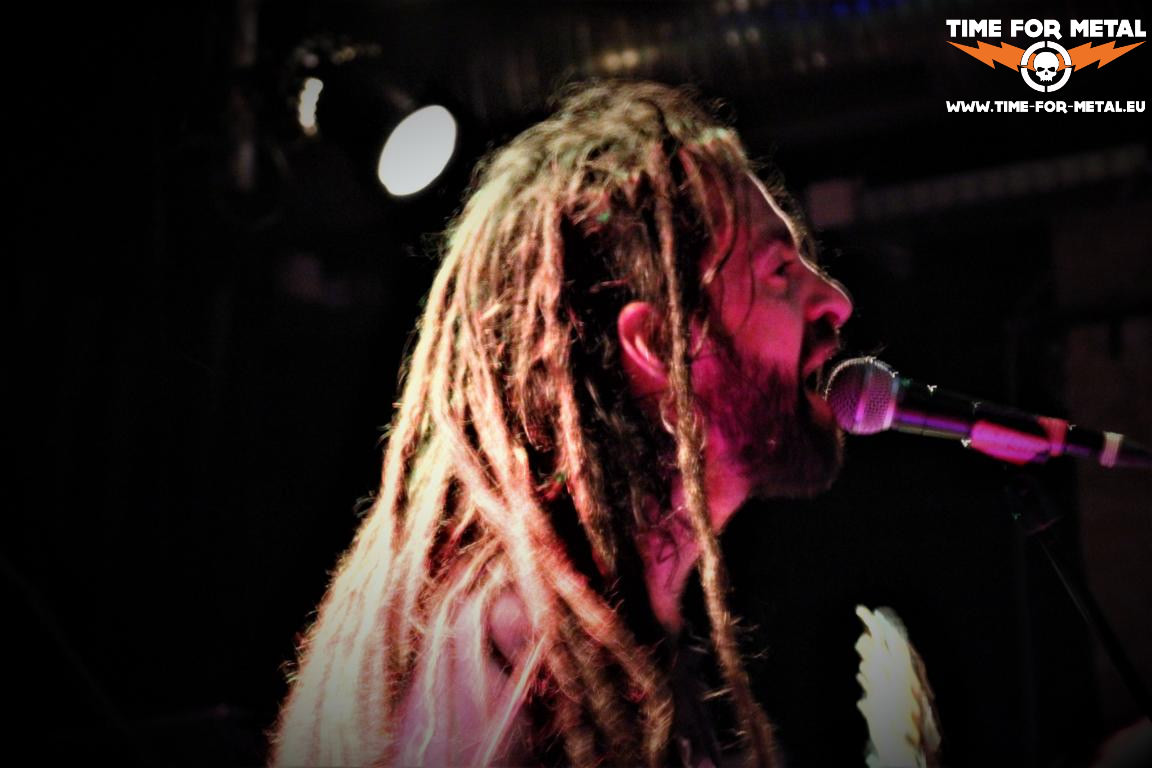 Es folgen Dopethrone, ebenfalls aus Kanada, die einen wilden Doom / Sludge Mix bieten. Das Licht wird nur ein paar Partikel heller. Bei der Band tut sich besonders Sänger / Gitarrist Vincent Houde hervor. Ellenlange Rastalocken sind sein Markenzeichen. Er ist eine Menge mehr auf der Bühne in Bewegung als sein Vorgänger eben. Dopethrone machen gewaltig Laune. Entsprechend ihres Namens ist auch viel Zeug unterwegs. Benannt nach dem 2000er-Album der Band Electric Wizard bringen Dopethrone am heutigen Abend zwei Songs ihres neuen Albums Transcanadian Anger auf die Bühne. Der Rest sind ältere Songs vorangegangener Scheiben. Transcanadian Anger haben sie als limitierte Testpressung auf schwarzem Vinyl dabei. Die muss ich mir natürlich mitnehmen. Bekomme sie sogar noch von der Band signiert. Vincent Houde wird sich später noch als größter Fan von Church Of Misery outen.
