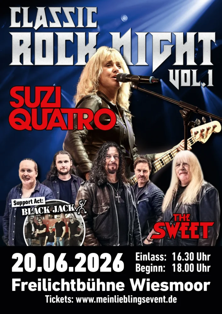 Wiesmoor bereitet sich auf ein musikalisches Highlight vor: Am 20.06.2026 verwandelt sich die Freilichtbühne Wiesmoor in ein Mekka für alle Fans zeitloser Rockmusik. Bei der Classic Rock Night Vol. 1 stehen mit Suzi Quatro, The Sweet und Black Jack drei echte Live-Acts auf der Bühne, die Rockgeschichte geschrieben haben.