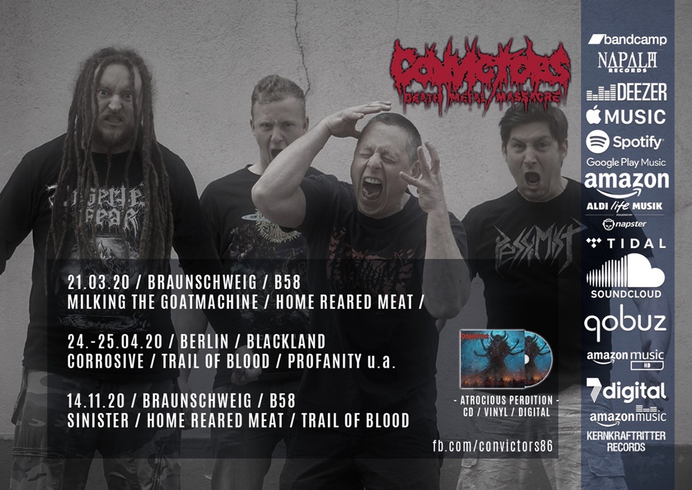 Das Konzert der Lörracher Old School Death Metal Band Convictors am 21. März 2020 im B58 in Braunschweig musste aufgrund der aktuellen Corona-Situation abgesagt werden. Ein Ersatztermin wird zu einem späteren Zeitpunkt geplant. Beachtet die Facebook-Seite der Band: https://www.facebook.com/Convictors86/
