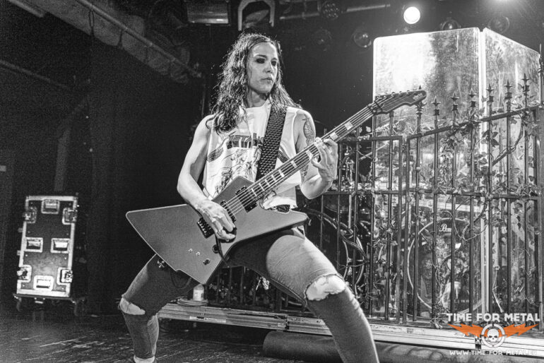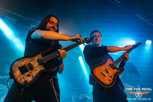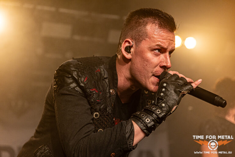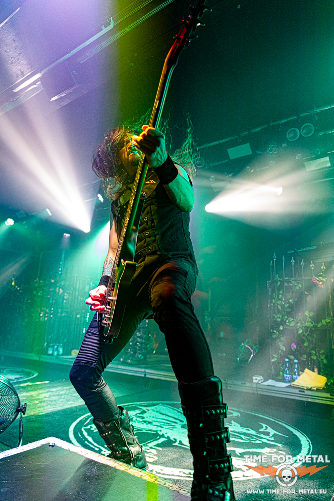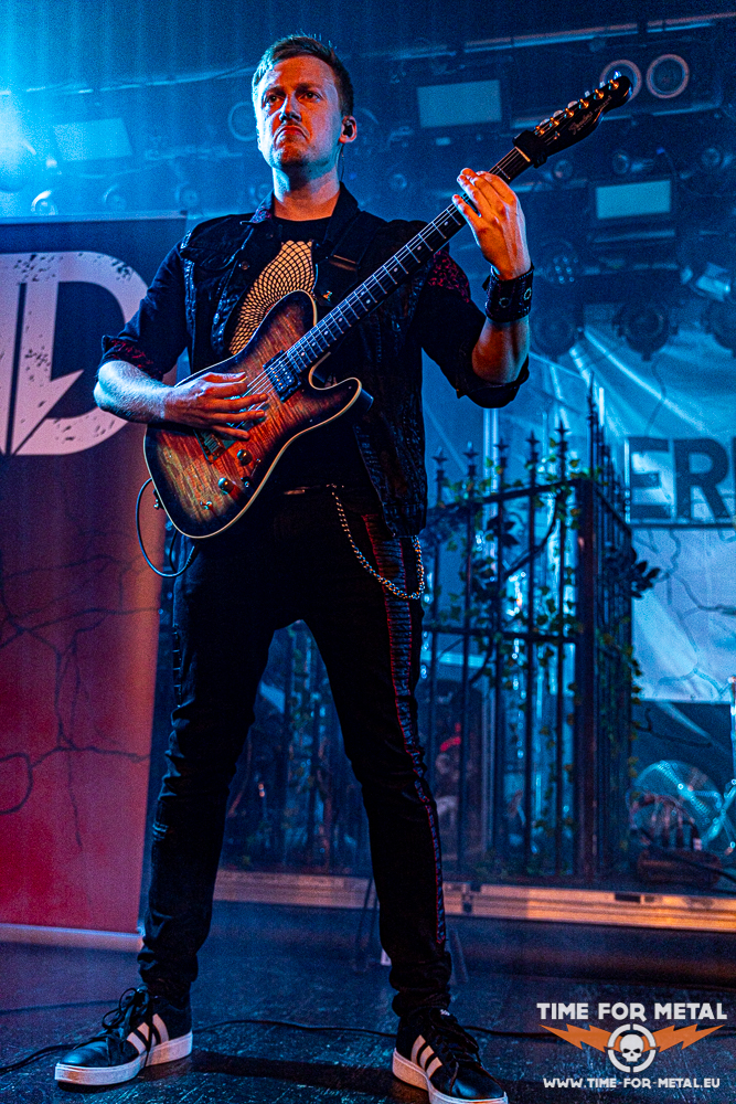Aber auch die Vorbands können die Menge, die pünktlich zum Einlass um 19 Uhr im Colos-Saal sind, überzeugen. Als Erstes dürfen an dem Abend Terra Down aus den Niederlanden um 19:45 Uhr ran. Die Melodic Death Band steigt gleich richtig ein, die Bühne ist mystisch beleuchtet und immer wieder gibt es „Are you Entertained“-Rufe von Sänger Nick Brouwer, der wohl selbst ein großer Cradle-Fan ist und auch immer wieder den Headliner in seinen Ansagen huldigt. Gute Stimmung verbreitet er natürlich auch auf der Bühne mit Songs wie To Sweet And Cold, Accept Your Fate oder Checkmate. Selbst nach nur einer halben Stunde sieht man, dass auch die Bands der Hitze gnadenlos ausgeliefert sind. Stimmung und Venue sind gleichermaßen am Kochen.