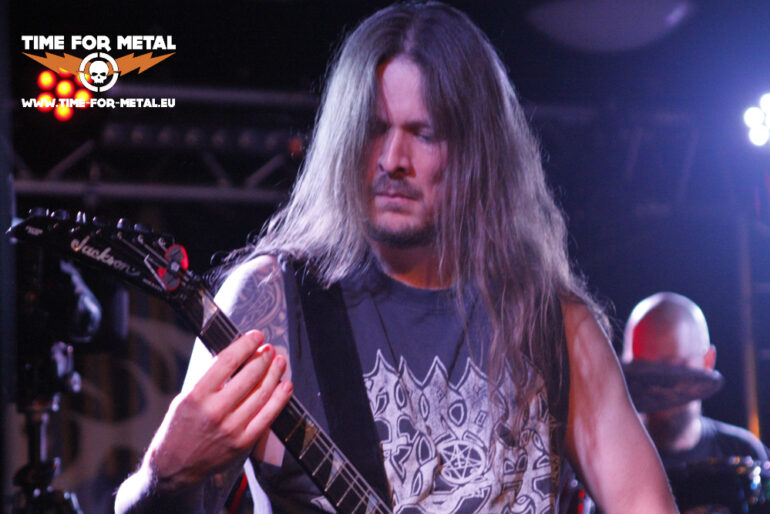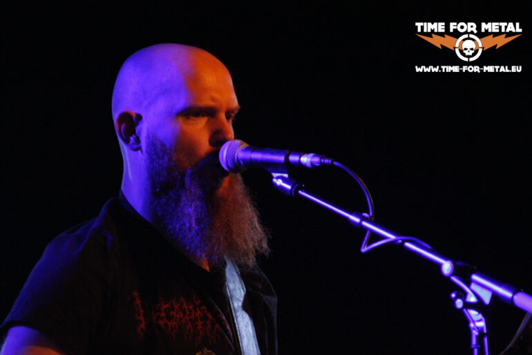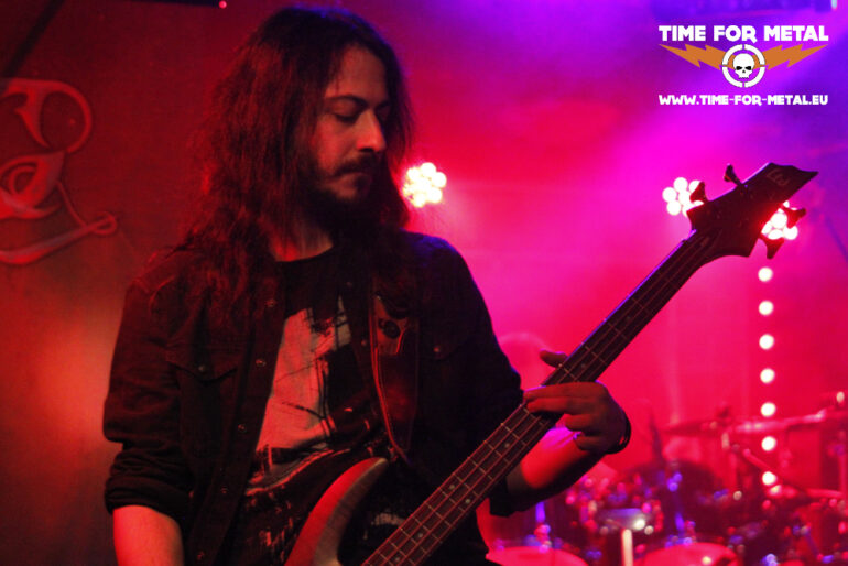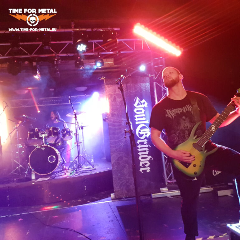 Umbaupause, ein wenig quatschen und ab nach vorne, denn meine Kumpels von Soul Grinder stehen bereit und legen gleich nach dem Intro mit dem Song Cursed Covenant ordentlich los. Der Laden scheint ein wenig gefüllter zu sein und mehrere Personen schütteln ihren Kopf und auch die ersten Bewegungen nehme ich wahr. Der Death Metal der Band kommt bei der Meute recht gut an. Ist ja auch ein fettes Ding. Mathias bedankt sich natürlich bei der Vorband und für die Einladung, und der nächste Song Malevolent Reality lädt wieder zum Bangen ein. Die Band ist mit ihrem neuen Album eingereist und spielt auch davon die Songs Frozen Halls und Amourphous Blight. Sehr gute Auswahl, wie ich finde, denn dazwischen wird noch der Song Supreme Enemy präsentiert. Zum Mitgrölen und langsamem Bangen lädt dann der Song Spiri’s Asylum ein. Diese Mischung aus groovigem Death Metal, Ballerparts und melodischen Leads, die vom Black Metal getrieben werden, gefällt anscheinend nicht nur mir. From The Nether Realm, Dreaded Fate und Omnious Retribution folgen, bevor man dann mit Infernal Suffering das Ende einläutet. Wieder einmal ein gelungener Auftritt der Bremer. Ein Manko ist jedoch vorhanden. Es fehlt der Song Night‘s Bane. Aber irgendetwas ist ja immer. Weiter geht es mit dem einen oder anderen Fachgespräch, u.a mit Anja Bathory, das „vierte“ Bandmitglied von Soul Grinder, welche mir netterweise meine Kamera vernünftig einstellt. Vielen Dank noch einmal dafür. Das Licht macht mich und meine Kamera fertig, und damit bin ich nicht allein, wie ich in Gesprächen feststelle. Egal, denn nun geht es weiter.