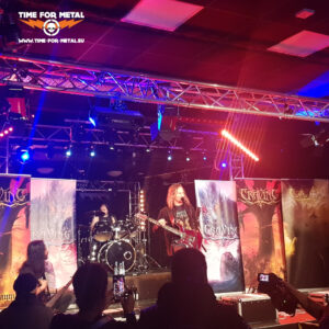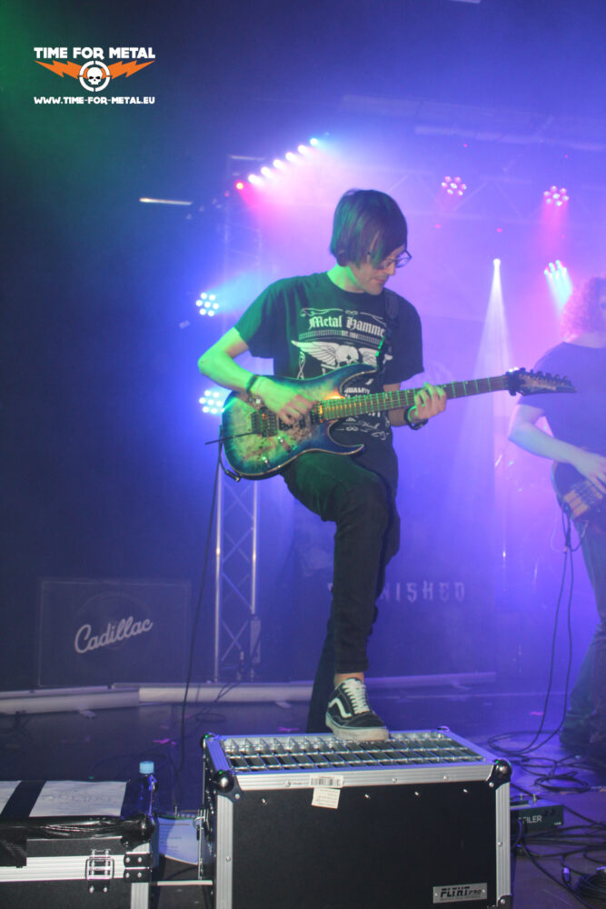 Den Anfang machen die recht jungen Zeitgenossen von CimaeriC aus Braunschweig. Im Gepäck haben sie ihre aktuelle EP namens Tarnished. Der Sänger ist auch erst seit kurzem dabei und so präsentiert man sich recht frisch. Man fängt aber nicht pünktlich an, sondern einige Minuten ziehen ins Land, bevor es losgeht. Nicht alle der ca. 100 Leute finden den Weg nach vorne, aber diejenigen, die da sind, haben beim ersten Song namens Born From Blackness auch gleich ihren Spaß. Der Song ist recht Metalcore-lastig und lebt von den kraftvollen Vocals. Einige Melodic-Death-Metal-Elemente gesellen sich dazu. Weiter geht es mit dem Song Tarnished Observance. Auch hier regieren die corigen Momente und dadurch kann man einen guten Groove erzeugen. Die growligen Vocals können mich absolut überzeugen. Auch die nachfolgenden Songs The Malady Remains und Wilted schlagen in die gleiche Kerbe und bringen gerade den jüngeren Metalheads Freude. Ich finde, es fehlt ein wenig der Bums, aber das ist natürlich eine persönliche Sache. Bei Rapture Of The Tribes wurde Schnelligkeit in Form einer fixen Double Bass versprochen. Der Song klingt auch ganz geil, ist mehr Death-Metal-lastig und die Double Bass ist auch druckvoll, aber schnell ist meines Erachtens etwas anderes. Liegt natürlich im Auge des Betrachters. Der anschließende Track, The Many glaube ich, gefällt mir da schon besser, denn hier bewegt man sich im melodischen Death Metal, der im Midtempo dargeboten wird und schön druckvoll ist. Kleine Geschwindigkeitsveränderungen bringen eine gewisse Abwechslung in die Geschichte. Weiter geht es mit der Mischung aus Melodic Death Metal und Metalcore. Den letzten Song darf man aus Zeitgründen nicht mehr spielen, und so verabschiedet man sich beim Publikum, welches die Band durchaus feiert.