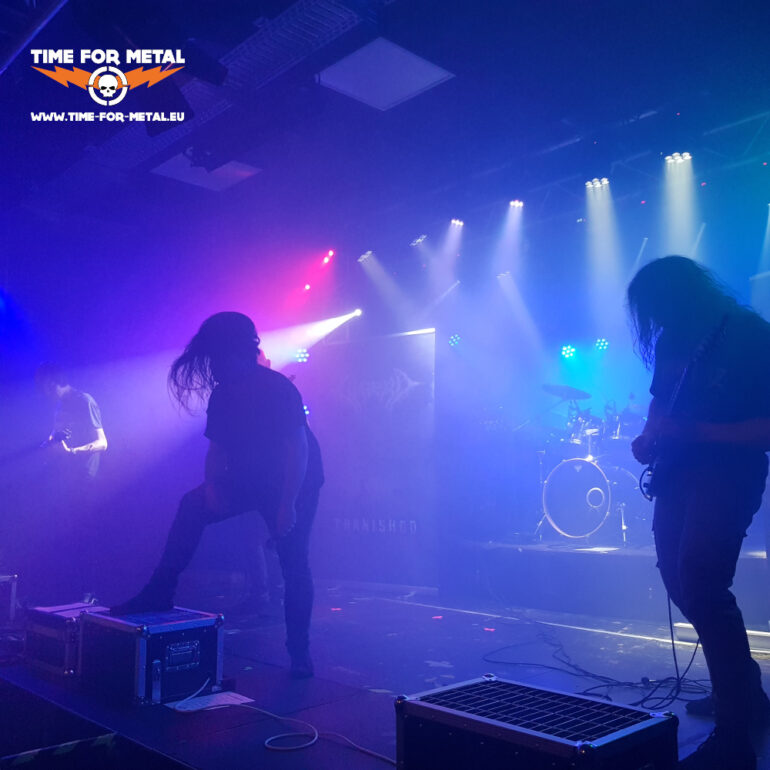 Als zweite Band des Abends betreten Frostshock die Bühne – eine Truppe aus Haltern Am See, die sich mit energiegeladenem Thrash Metal zwischen moderner Härte und melodischen Death-Metal-Anleihen positioniert. Der Sound ist klar im harten Thrash-Gefilde verankert, geprägt von einem kraftvollen Gitarrenduell und treibenden Riffs. Die Vocals erinnern an das Ende der Achtziger: rau, wuchtig und mitreißend. Während der Frontmann und Gitarrist Flemming Wehren agil über die Bühne fegt, zeigen sich die übrigen Bandmitglieder eher statisch – doch das tut der Intensität des Auftritts keinen Abbruch. Nebelschwaden umhüllen die Bühne, während sich kleine Pits vor der Bühne bilden. Auch wenn die ersten Reihen nur zögerlich gefüllt sind, ist der restliche Konzertsaal gut besucht, und die Atmosphäre dicht und geladen. Mit Web Of Lies, ihrer aktuellen Single, die erst letzte Woche erschienen ist, geben Frostshock einen Vorgeschmack auf ihr kommendes Album Hibernations End, das am 22.11.2025 erscheinen wird.