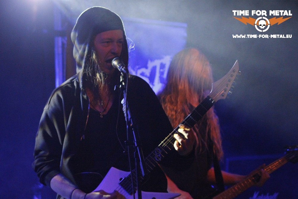 Ivan Chertov und seine Member sind auf der Bühne. Links und rechts stehen je drei Banner. Sieht gut aus. Ivan kündigt eine Rede an, hält sich aber überraschenderweise recht kurz, erklärt noch einmal das Zwei-Tages-Konzept, und dann verlassen sie die Bühne, um nach dem Intro loszulegen. Die Aufregung ist am Anfang ein wenig zu spüren, aber diese ist schnell verflogen, zumindest merkt man diese nicht mehr so. Der Song V Les (Into The Forest) ist schon sehr alt und stammt von der ersten EP namens Revenge aus dem Jahre 2008. Gefühlt sind jetzt alle Anwesenden im Raum und die meisten kennen das Material der Band. Ein guter Einstieg. Targarven Wrath vom Album At Dawn folgt und natürlich heizt die Band das Publikum ordentlich ein. Bei einem Heimspiel macht so etwas natürlich doppelt Spaß. Ich muss zugeben, dass ich nicht alles von der Band mag, aber wenn sie am Knüppeln sind oder die Death-Metal-Elemente aufwirbeln, mag ich es. Immer erklingen Ambienteklänge vor den Songs, so auch vor und nach dem Song Leopard. Anschließend folgt die Nummer Spirits Of The Dead. Dieser sagt mir total zu, denn auf der einen Seite zeigen sie sich sehr melodisch und zwar gut, auf der anderen Seite knüppeln sie ohne Ende. Gute Mischung, geiler Song. Der sehr Pagan-lastige Song Wolfsherz aus dem Jahre 2012 kommt bei den Leuten super an, bei mir eher so lala. Und so geht es heute Abend weiter und nach dem Song Hellraiser vom Album At Dawn verlässt man die Bühne. Einige schreien Zugabe und natürlich kommen sie noch einmal wieder, schreien zusammen mit den Fans Zugabe und es folgt noch der Song By The Blowing Wind. Auch der Song hat schon 13 Jahre auf dem Buckel und stammt vom Debütalbum Craving. Die Trademarks werden noch einmal deutlich. Pagan, Death und Black Metal sind die Zutaten, welche die Band gerne verwendet und so auch am Ende des Sets.