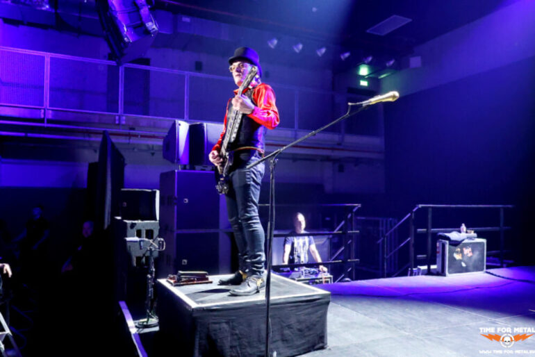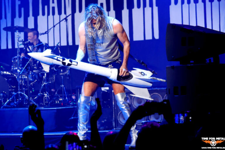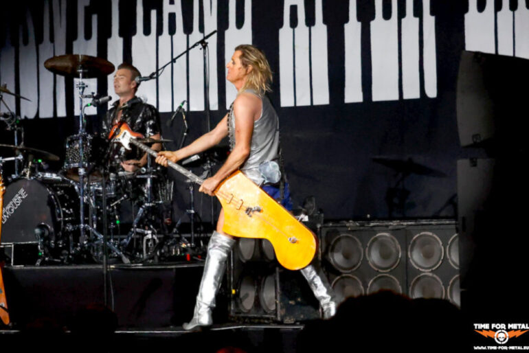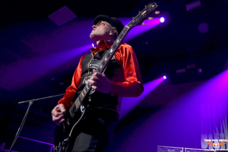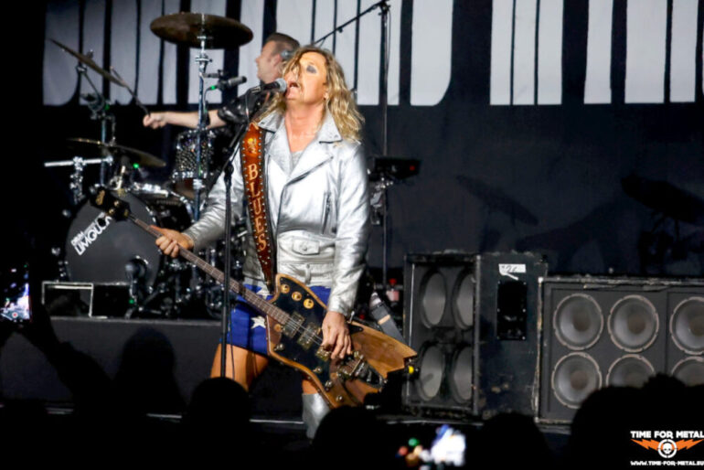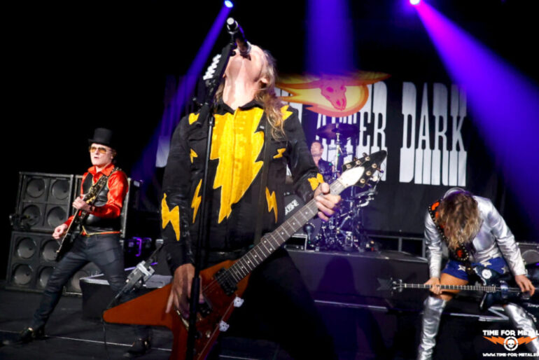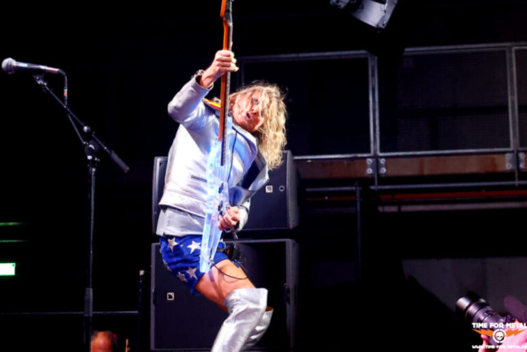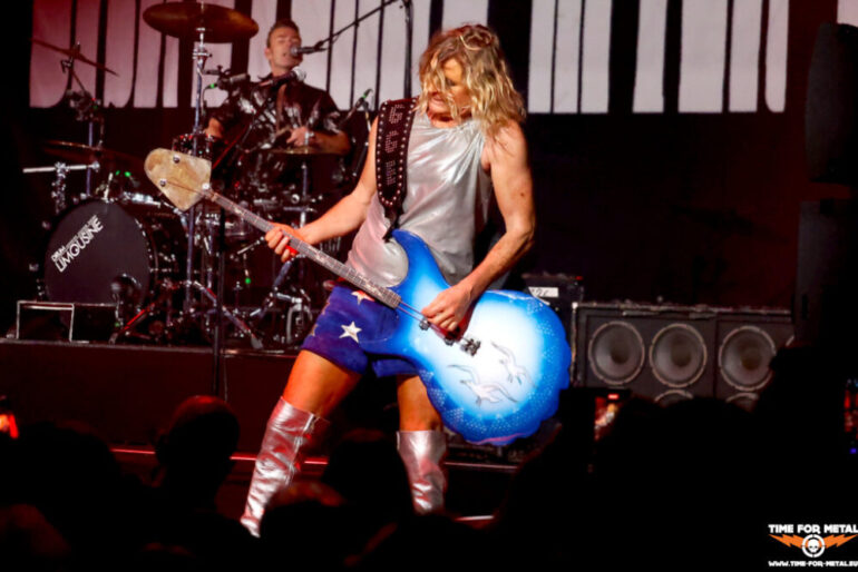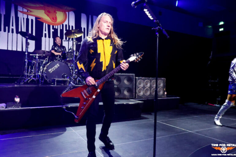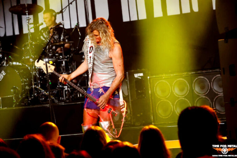 22 Uhr, es ist Zeit für den Headliner. Die Klassiker Jihad und Girl Nation vom 1989er-Release No Fuel Left For The Pilgrims, das in Dänemark mit Doppelplatin ausgezeichnet wurde, machen den Anfang. Der Hingucker ist Bassist Stig Pedersen. Der startet zunächst mit dem Modell „durchsichtig“. Im Laufe der Show gibt es metallische Kreuze, Raketen, Tropfenform, Schatulle und weitere Modelle, fast immer als 2-Saiter. Die Bass-Show ist ein Highlight bei den Gigs von D-A-D.