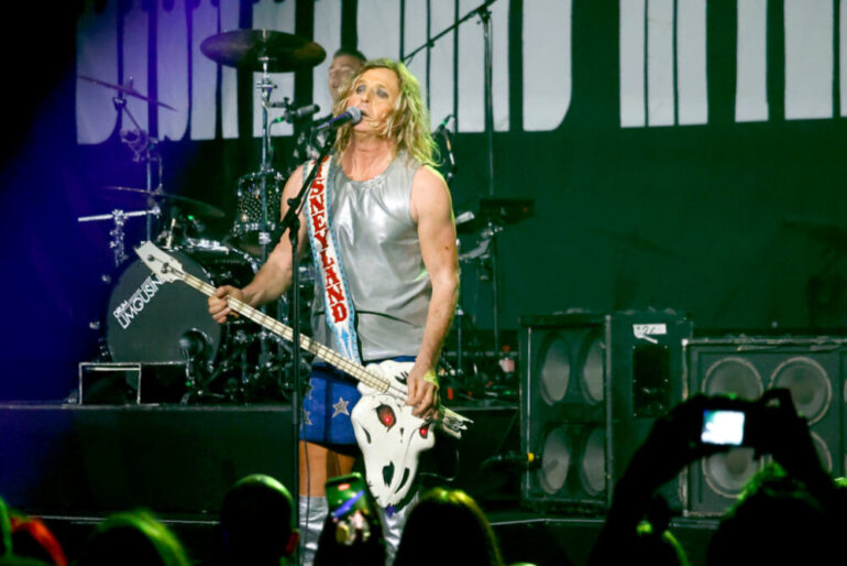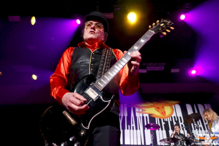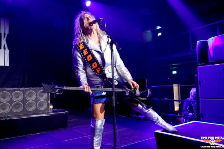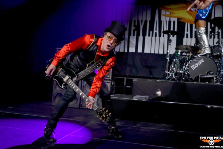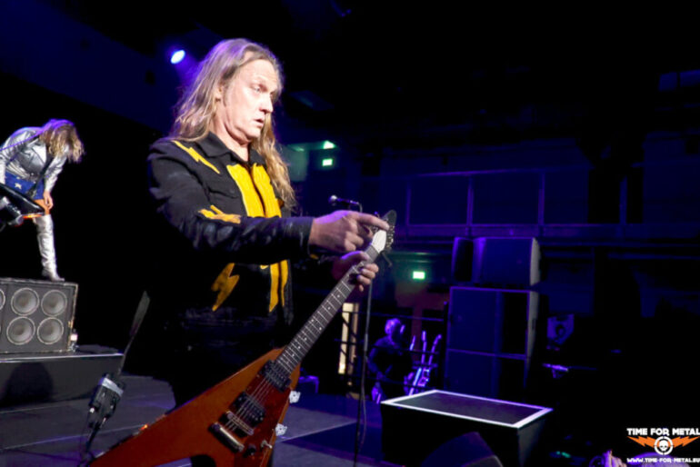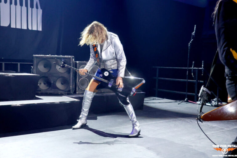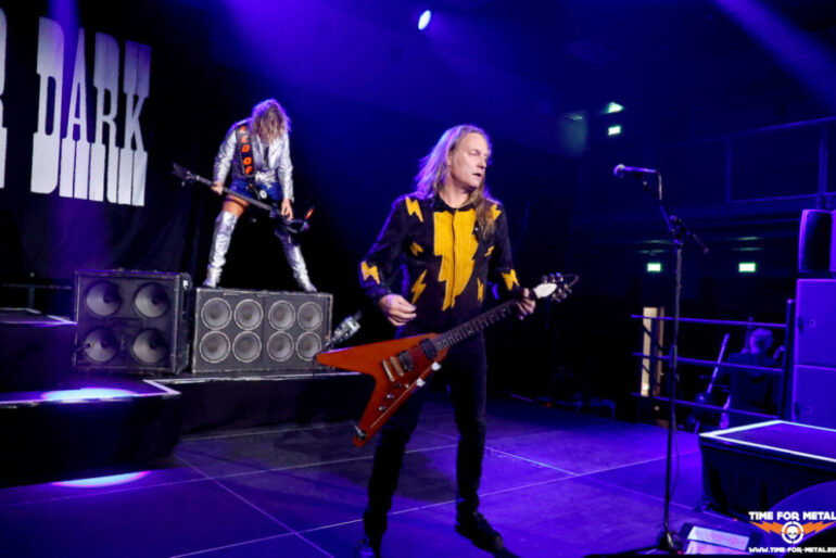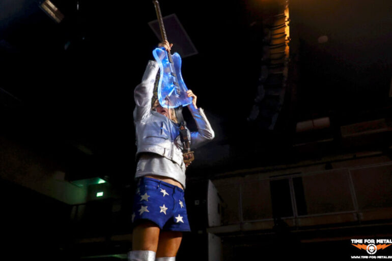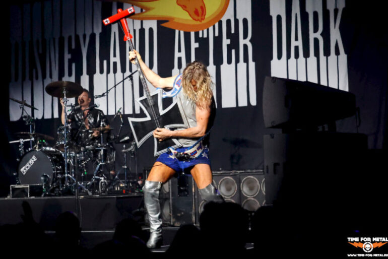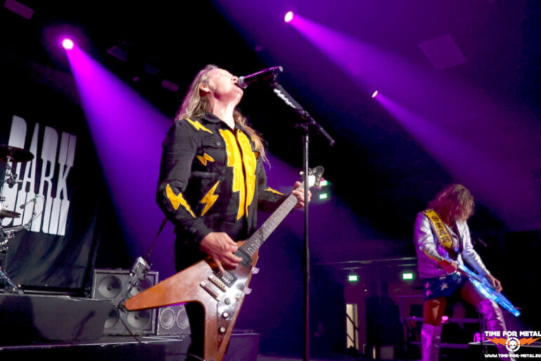 22 Uhr, es ist Zeit für den Headliner. Die Klassiker Jihad und Girl Nation vom 1989er-Release No Fuel Left For The Pilgrims, das in Dänemark mit Doppelplatin ausgezeichnet wurde, machen den Anfang. Der Hingucker ist Bassist Stig Pedersen. Der startet zunächst mit dem Modell „durchsichtig“. Im Laufe der Show gibt es metallische Kreuze, Raketen, Tropfenform, Schatulle und weitere Modelle, fast immer als 2-Saiter. Die Bass-Show ist ein Highlight bei den Gigs von D-A-D.