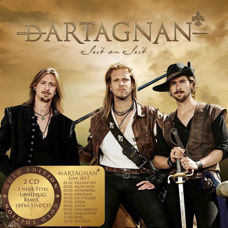 Nachdem das Debütalbum der drei Nürnberger Musketier-Rocker dArtagnan Platz 7 der Charts erreichte und über 14 Wochen in den Top 100 blieb, erschien im Oktober 2016 die GOLD-Edition des Albums Seit An Seit. Neben einer kompletten Live-CD als Bonus enthält die Auflage drei neue Tracks sowie die Single Komm mit remixed by Unheillig. Bei diesem Erfolg wollen wir lieber spät als nie über das Debüt des Folk Rock-Trios berichten, das gleich unter der Sony Music-Flagge segeln durfte.