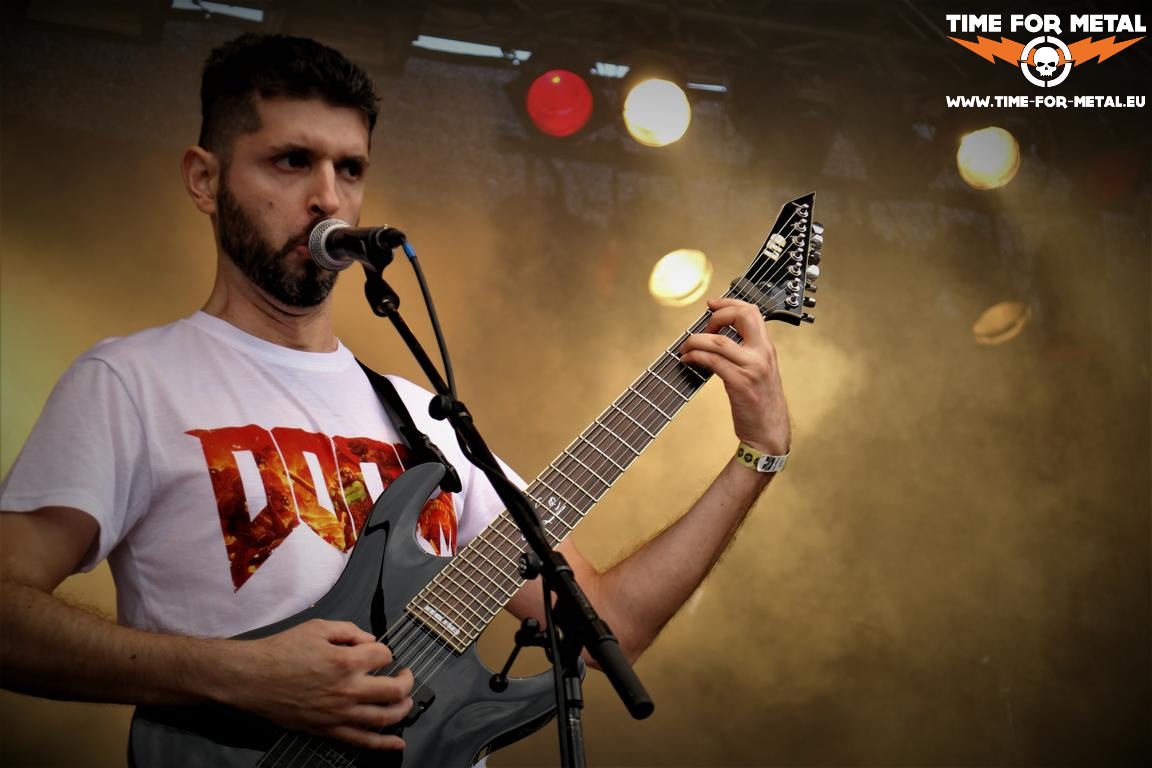 Guineapig sind für viele am heutigen Tag eine positive Überraschung. Für mich eher nicht, denn die wollte ich schon immer sehen und ich kenne ihre Musik. Dabei ist das Trio noch nicht so lange unterwegs, gerade mal fünf Jahre. Erst ein Album mit dem Titel Bacteria steht zu Buche. Von dem kommen auch die Songtitel, die Guineapig uns hier im schönsten Goregrind um die Ohren jagen. Während ihres Gigs tummelt sich permanent ein aufblasbarer Dino vor der Bühne herum. Das verleitet Gitarrist und Sänger Fra zur Ansage „Lets go for T Rex“. Jetzt setzt sich der Moshpit mit T Rex in der Mitte in Bewegung. Ausgelassene Stimmung auf dem Platz.