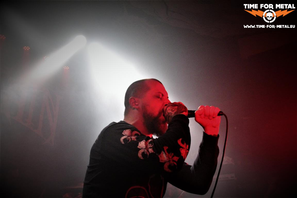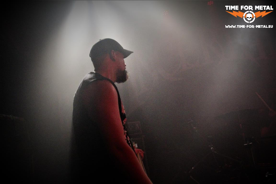 Weiter geht es mit den Wuppertalern Grim Van Doom. Mit den Jungs habe ich mich bereits in einer der Pausen vorher unterhalten und mir das Album Grim Love auf Vinyl mitgenommen, das sie löblicherweise auch in diesem Format dabei haben. Ein Kumpel von mir hat Grim Van Doom irgendwo mal als Vorband gesehen und mich vorgewarnt. Da würde was Großartiges auf mich zukommen. Und genauso ist es. Ich bin auch jetzt noch richtig beeindruckt von den Jungs. Sie packen am heutigen Abend hier in Limburg den Hammer of Doom aus und schlagen damit gnadenlos zu. Das ist schon ein geiles Gebräu aus Doom, Sludge und ein wenig Hardcore, das die Band hier abliefert. Ich bin selbst ein bekennender Doom Fan und habe in der letzten Zeit einige aktuelle Doomalben für Rezensionen in der Hand gehabt. Das was Grim Van Doom hier abliefern schlägt alles. Rauh, gewaltig, düster und brutal. Lansky, der Sänger im Shirt der Sludgelegende Crowbar ist sehr gewaltig mit seinen Voices. Die Band um ihn herum schafft die notwendige Stimmung im Downtempo. Apropos Crowbar: Kirk Windstein und seine Band habe ich schon mehrmals gesehen. Das letzte Mal Ende 2017 im Underground in Köln. Grim Van Doom beeindrucken heute die Fans mächtig. Da darf ein kurzer Wink zur Sludgelegende Crowbar schon sein. Grim Van Doom müssen sich auch hinter Crowbar nicht verstecken. Ein Wahnsinnsfeeling, was die Jungs von Grim Van Doom hier aufbauen. Doom und Sludge aus den Sümpfen von Wuppertal, wenn es die dort überhaupt gibt. Aber so ähnlich muss man sich das vorstellen, was die Jungs hier abliefern. Die Songs, die dargeboten werden, stammen von der LP Grim Love und der Split LP Grim Van Doom / Cult Of Occult. Nach 45 heftigen Minuten endet dann der Gig und die Fans sind richtig baff. Der Hammer of Doom hat mit voller Breitseite zugeschlagen.