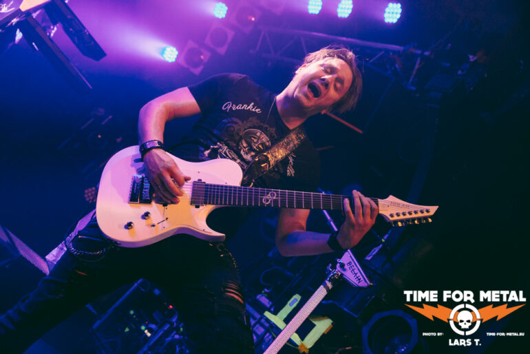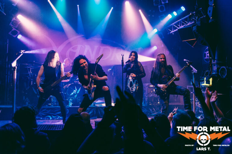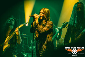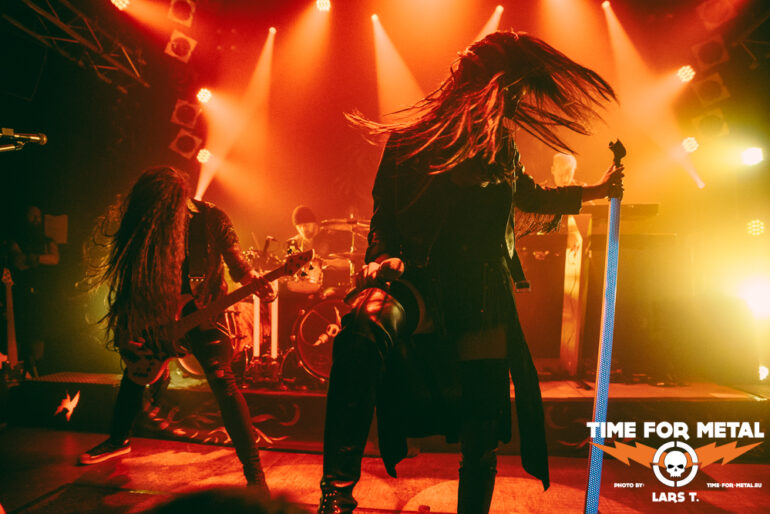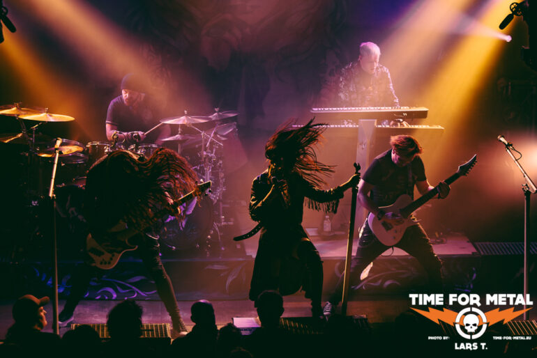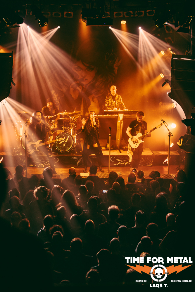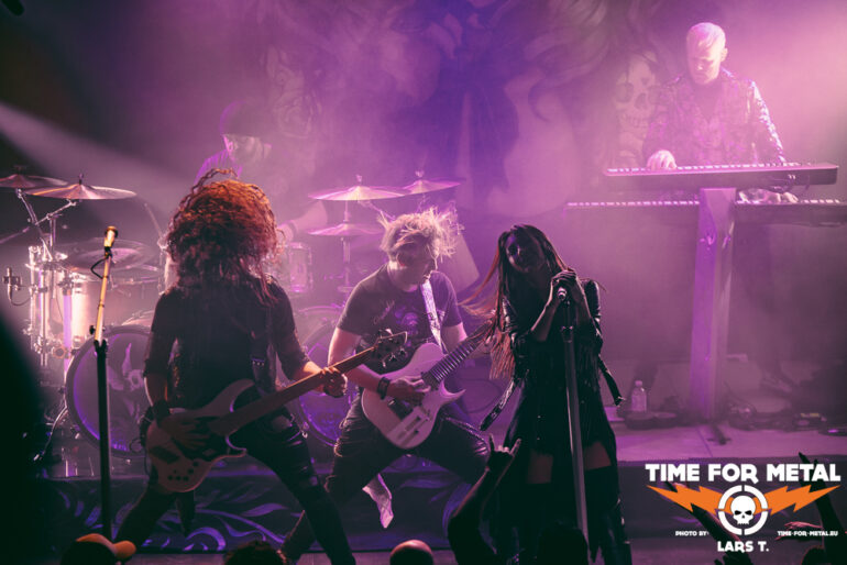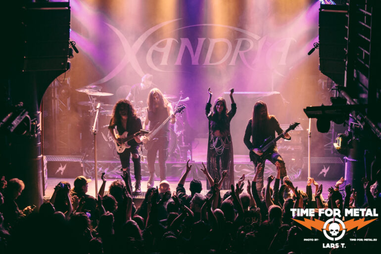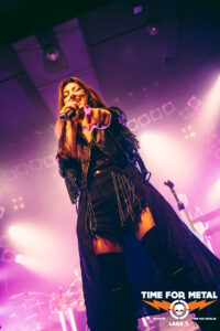 Es wird dunkel und das Intro läuft. Xandria haben im Februar dieses Jahres ihr neues Werk The Wonders Still Awaiting vorgestellt, wir erwarten also reichlich neue Songs. Und so kommt es auch. Mit You Will Never Be Our God starten die Bielefelder in ihr Set. Für die Aufnahmen (Video und Album) konnte Ralf Scheepers (Primal Fear) gewonnen werden. Die gesundheitlich angeschlagene Sängerin Ambre Vourvahis überlässt die Showeinlagen zwar weitestgehend den Saitenzupfern, stimmlich ist sie aber auf der Höhe. Mit Reborn und Ghost feuert das Quintett weitere Songs des neuen Albums hinterher, die vom Publikum gefeiert werden. In dem relativ kurzen Auftritt präsentieren uns Xandria einen ganzen Schwung neuer Hits, lediglich Nightfall vom 2014er-Album Sacrificium hat es zudem ins Programm geschafft. Die 2022 neu formierte Truppe um Marco Heubaum liefert eine tolle Show und weiß das Publikum mitzureißen. Die Fans sind begeistert und die Stimmung ist großartig. Ein weiteres Feuerwerk der neuen Platte, My Curse Is My Redemption, beschließt den überzeugenden Auftritt. Unter großem Beifall verlassen die Helden die Bühne. Es ist also angerichtet für den Headliner.