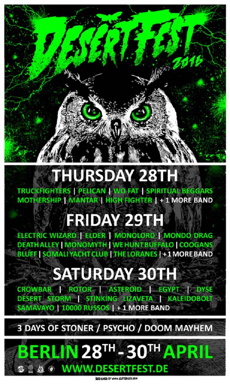 bietet das Desertfest Berlin, welches in diesem Jahr bereits zum 5. Mal stattfindet, DAS ultimative Heavyrock-Psycho-Doom Festival! 3 Tage voll von Heavy Rock, Stoner, Psychedelic und Doom Mayhem, mit mehr als 30 Acts auf 2 Bühnen, Visual Art Künstlern sowie einem Hippie-Markt erwarten euch vom 28. – 30.04.2016 im ASTRA KULTURHAUS im Herzen von Berlin.