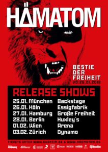 Und so wird auch das neue Hämatom – Jahr mit sechs exklusiven und wilden Beast-Release-Shows eingeläutet: Bei vier Shows in allen Himmelsrichtungen in Deutschland sowie jeweils einer Show in Österreich und der Schweiz präsentieren Hämatom im Januar ihren sehr wütenden neuen Sprössling.