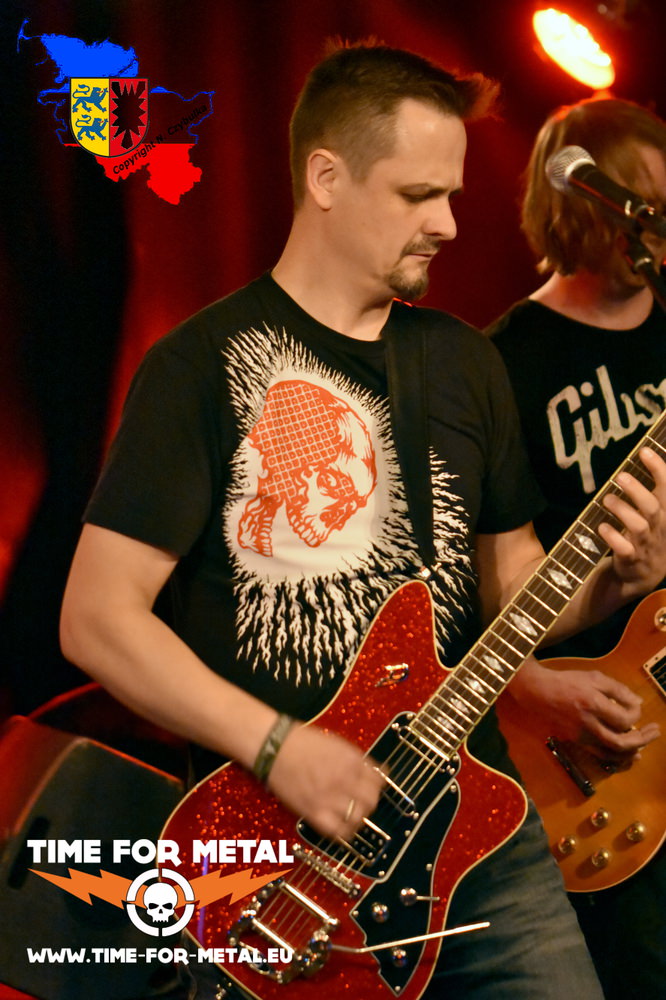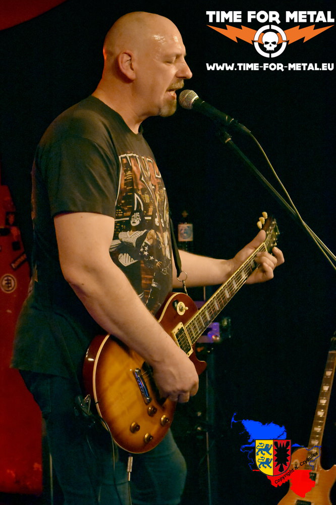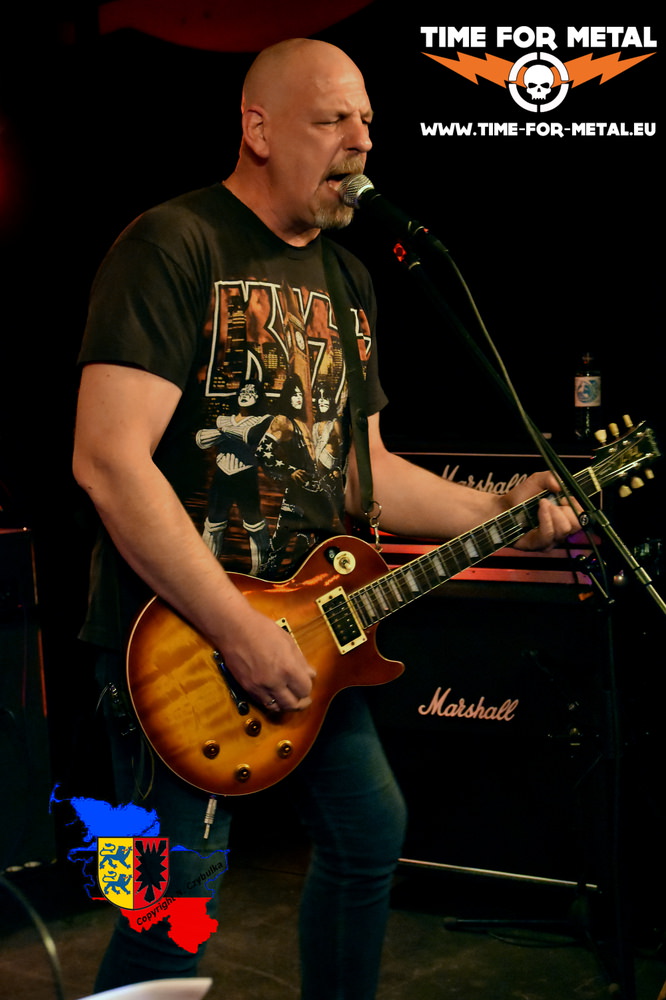 Die Band hatte bisher so meist zwei, drei Auftritte im Jahr, oft im privaten Rahmen. Zuletzt bei einem Sportfest im letzten Sommer gebucht, überzeugen sie hier vom ersten Takt an. Manchen Besuchern, die wegen TomKyle gekommen waren, blieb die Spucke weg, der eigene Anhang weiß, was kommt. Mit eigenen Songs im Genre Rock, Hardrock und Melodic Metal kommt Druck auf die Bühne. Perfekt beherrschen die Drei ihre Instrumente, das Programm wird sichtlich mit Spaß gespielt. Frontman ist Henrik Hagner. Sein Gesang dominiert die meisten Stücke. Zwar spielt er ebenso druckvoll die Gitarre, wirkt aber nie aufdringlich. Ansagen kommen, wenn überhaupt, kurz und knapp mit einer Portion Humor. Drummer Torsten Hüls hat sein Set so tief wie möglich auf der Bühne platziert. Das hat er gar nicht nötig. Druckvoll, konzentriert und präzise sitzt jeder Schlag auf seinem imposanten Drumset. Zudem macht er mir damit das Leben als Fotograf besonders schwer. Er sitzt hinter der eigentlichen Beleuchtung. Einzig rote Scheinwerfer, auf die Digitalkameras allergisch reagieren, sind auf ihn gerichtet. Christoph Cammas, früher schüchtern in der Ecke stehend, nimmt mittlerweile die Showaufforderung bei gesanglosen Passagen von Henrik Hagner an. Druckvoll aber schnörkellos auch hier die Darbietung am Bass. Seit nunmehr acht Jahren sind die Drei zusammen. In anderer Konstellation haben sie begonnen und probierten sich aus. Nun scheint die ideale Besetzung gefunden.