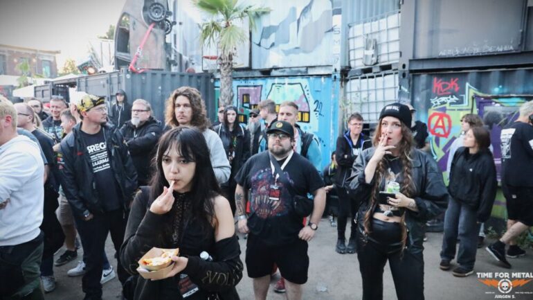 Heute und morgen stehen uns wirklich harte Zeitpläne bevor. Es ist ein ständiger Wechsel zwischen Indoor- und Outdoor-Bühne geplant, ohne Pausen dazwischen. Mein Vorteil ist, dass ich direkt Backstage unterwegs sein kann, sodass ich mir den Weg durch die Menge sparen und die Bands in Ruhe beobachten kann. Das Wetter zeigt sich wieder wechselhaft: Nach trockenen Phasen folgen immer wieder heftige Schauer. Das scheint die Festivalbesucher hier jedoch kaum zu stören – die Stimmung ist trotzdem großartig.